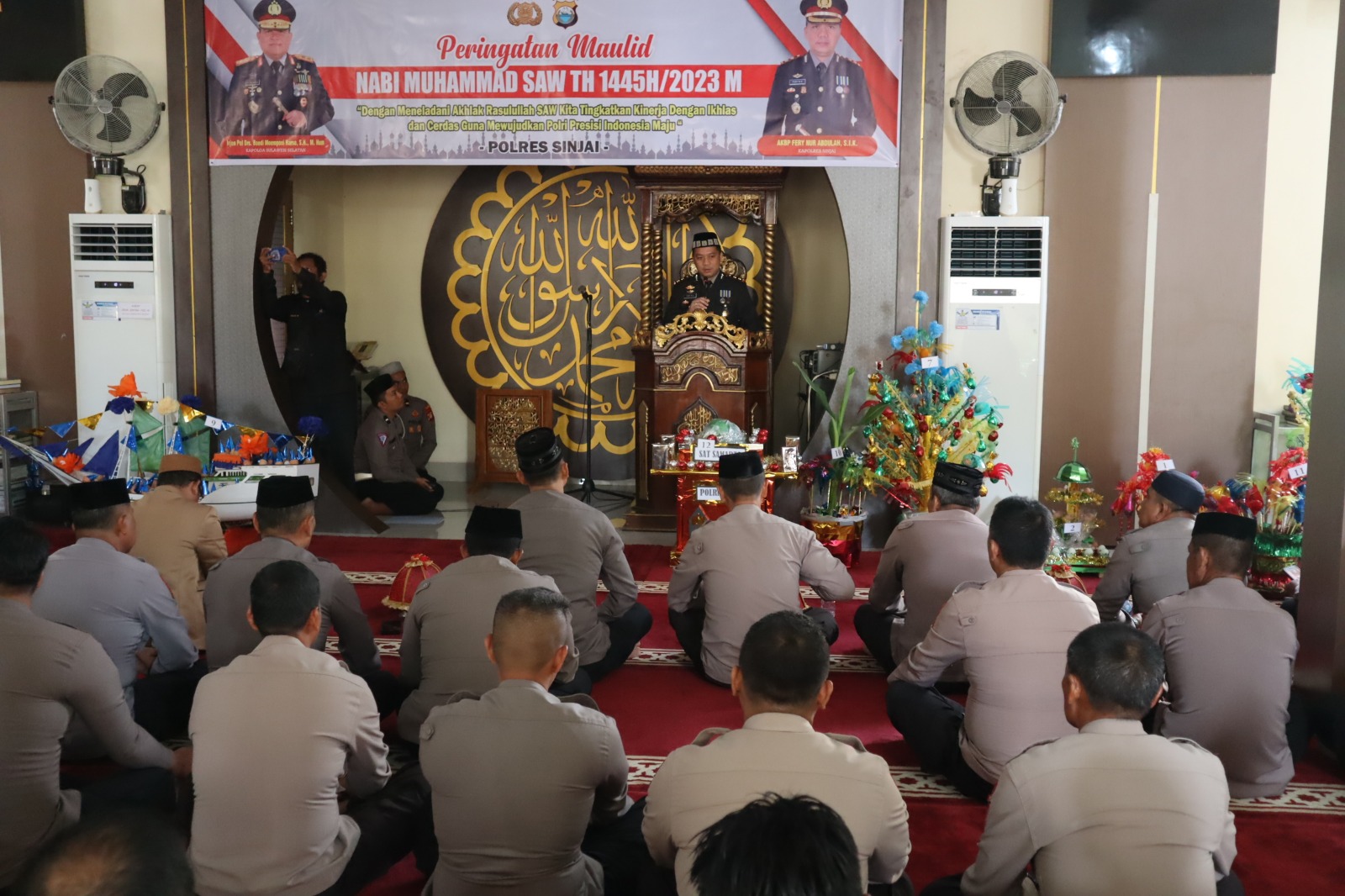 Peringatan Maulid Nabi Besar Muhammad SAW 1445 Hijriah Tahun 2023 mengusung tema ”Dengan Meneladani Akhlak Rasulullah SAW, Kita Tingkatkan Kinerja Dengan Ikhlas dan Cerdas Guna Mewujudkan Polri Presisi Indonesia Maju”.