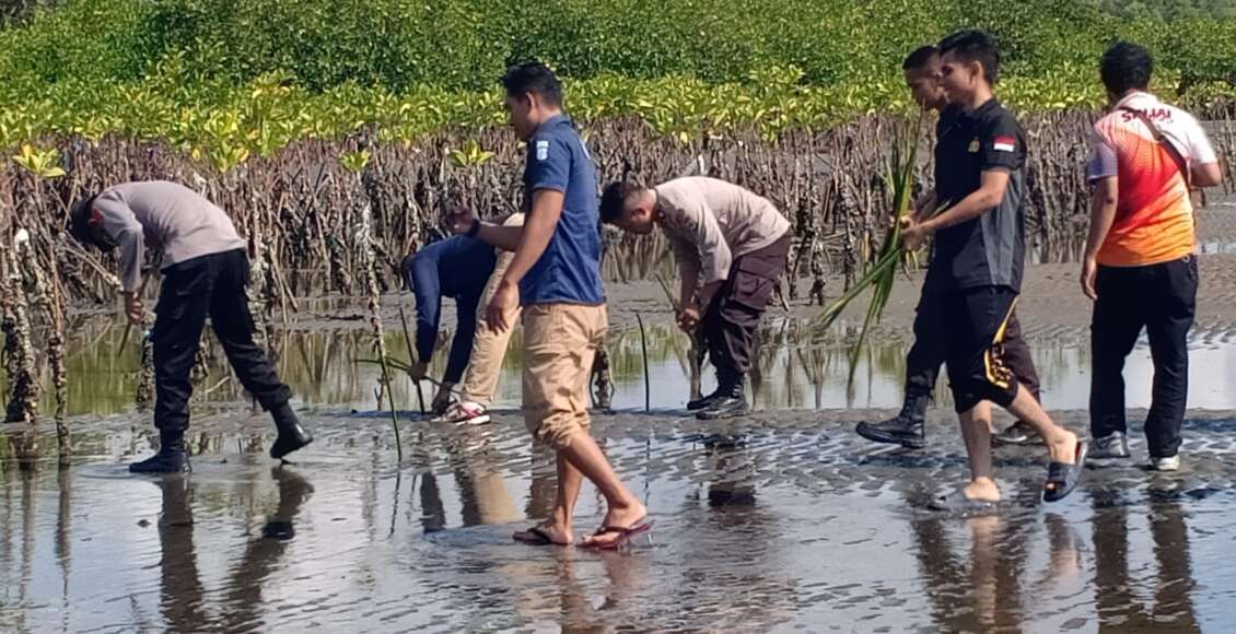 Penanaman bibit pohon mangrove yang dilakukan Kasi Humas Polres Sinjai Akp H. Suharto bersama anggotanya dan turut hadir Kabag Log Polres Sinjai Akp Pacong Bani, Kasubbag Bin Ops Bag Ops Polres Sinjai Akp Sudirman Mando, dan Kapolsek Sinjai Timur Iptu Herman,S.Sos., MH serta segenap personel Polres Sinjai.