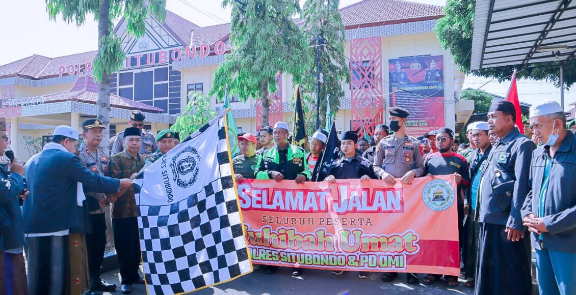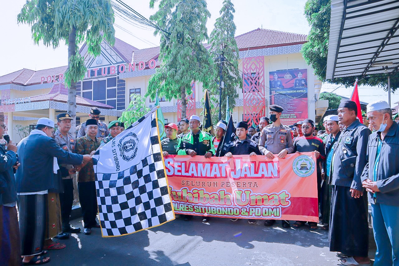 Pemberangkatan dan pelepasan peserta Muhibah Umat oleh Kapolres Situbondo AKBP Dr. Andi Sinjaya, S.H., S.I.K., M.H. yang diwakili oleh Wakapolres Kompol Pujiarto, S.H., M.H. bersama Ketua MUI Drs. Habib Muhammad Abu Bakar Al Muhdar, M.Pd., Ketua DMI KH. Zaini Mun’im Ridwan, Kepala Kemenag Drs. H. Slamet, M.Hi., Ketua Palopor H. Ismail, Ketua IKSASS Abu Rowi, dan Pengurus DMI Kab. Situbondo serta peserta dari Palopor, Banser, Laskar Hafas, Tim Kesehatan Bekam dan Santi dari Ponpes Salafiyah Syafi’iyah Sukorejo.