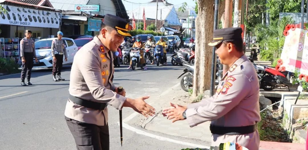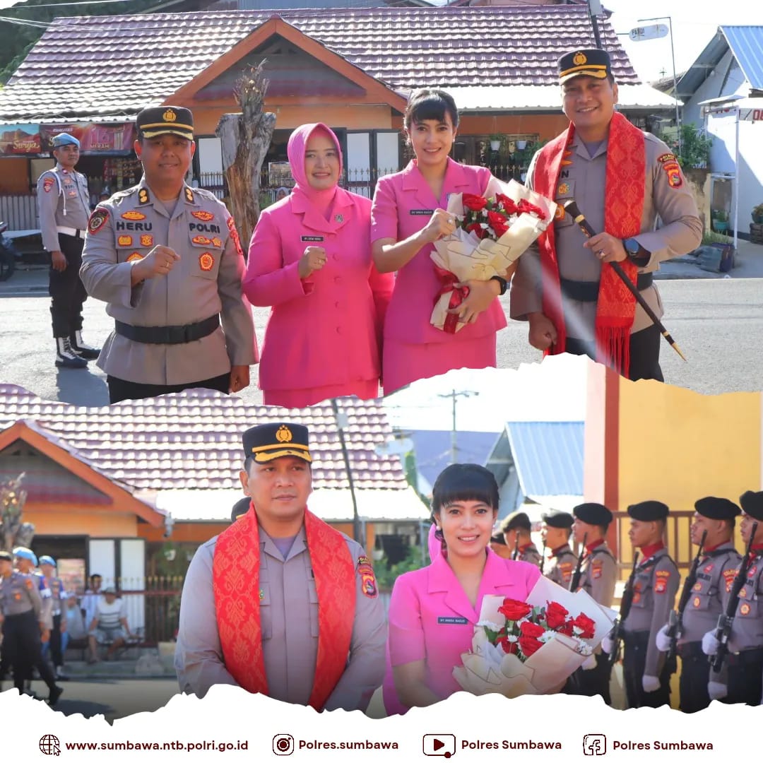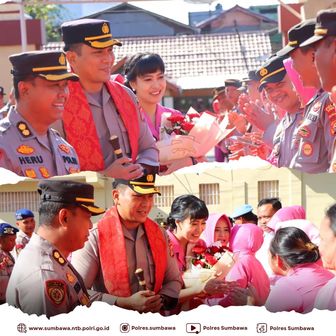 Penyambutan Kapolres Sumbawa yang baru, AKBP Bagus Nyoman Gede Junaedi, S.H., S.I.K., M.A.P., bersama Ny. Winda Bagus ditandai dengan pengalungan bunga, kemudian dilanjukan jajar kehormatan yang dilakukan oleh Sat Samapta.