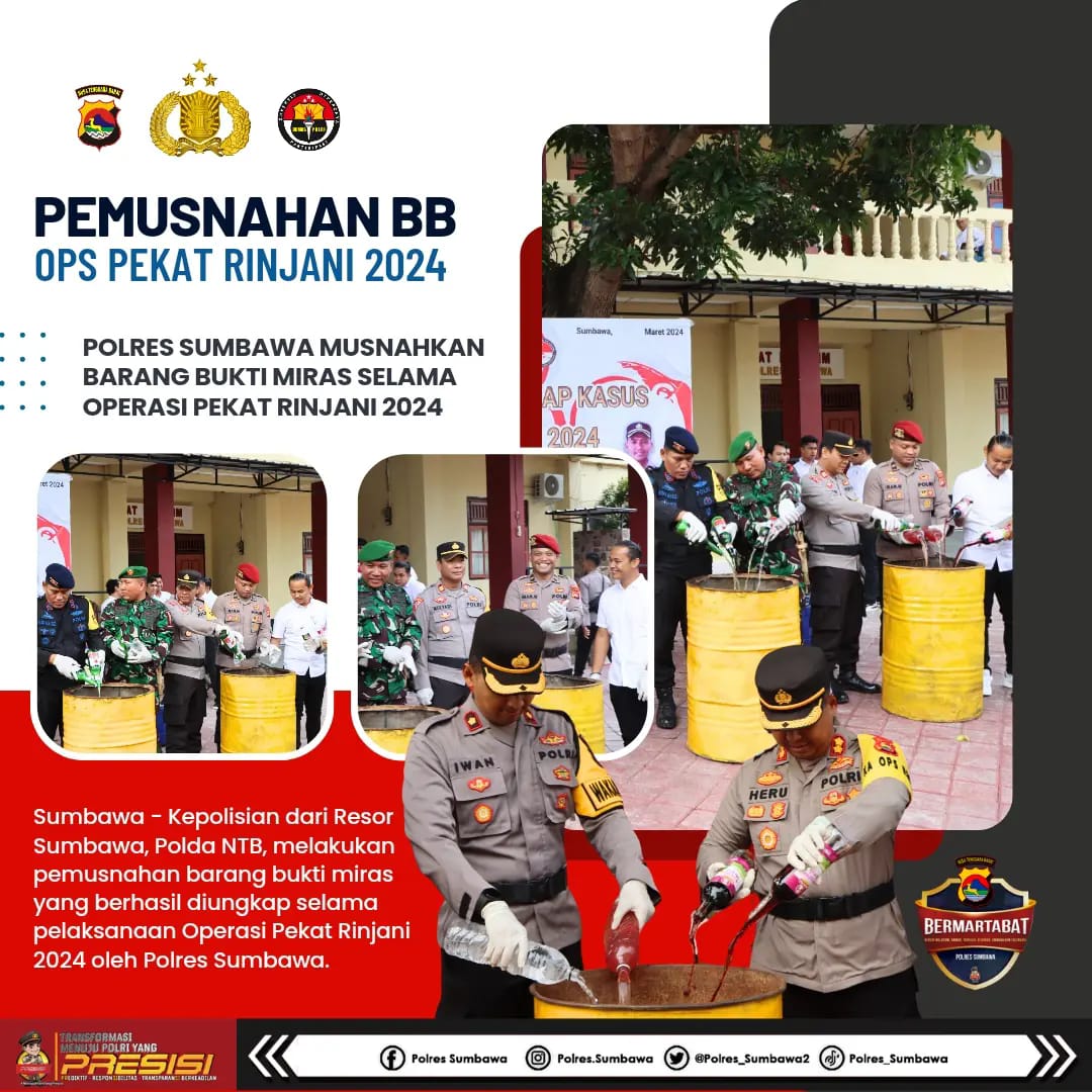 Kapolres Sumbawa, AKBP Heru Muslimin, S. IK M. IP, mengatakan, barang bukti yang dimusnahkan berupa miras yang terdiri dari arak, brem, anggur, dan bir.