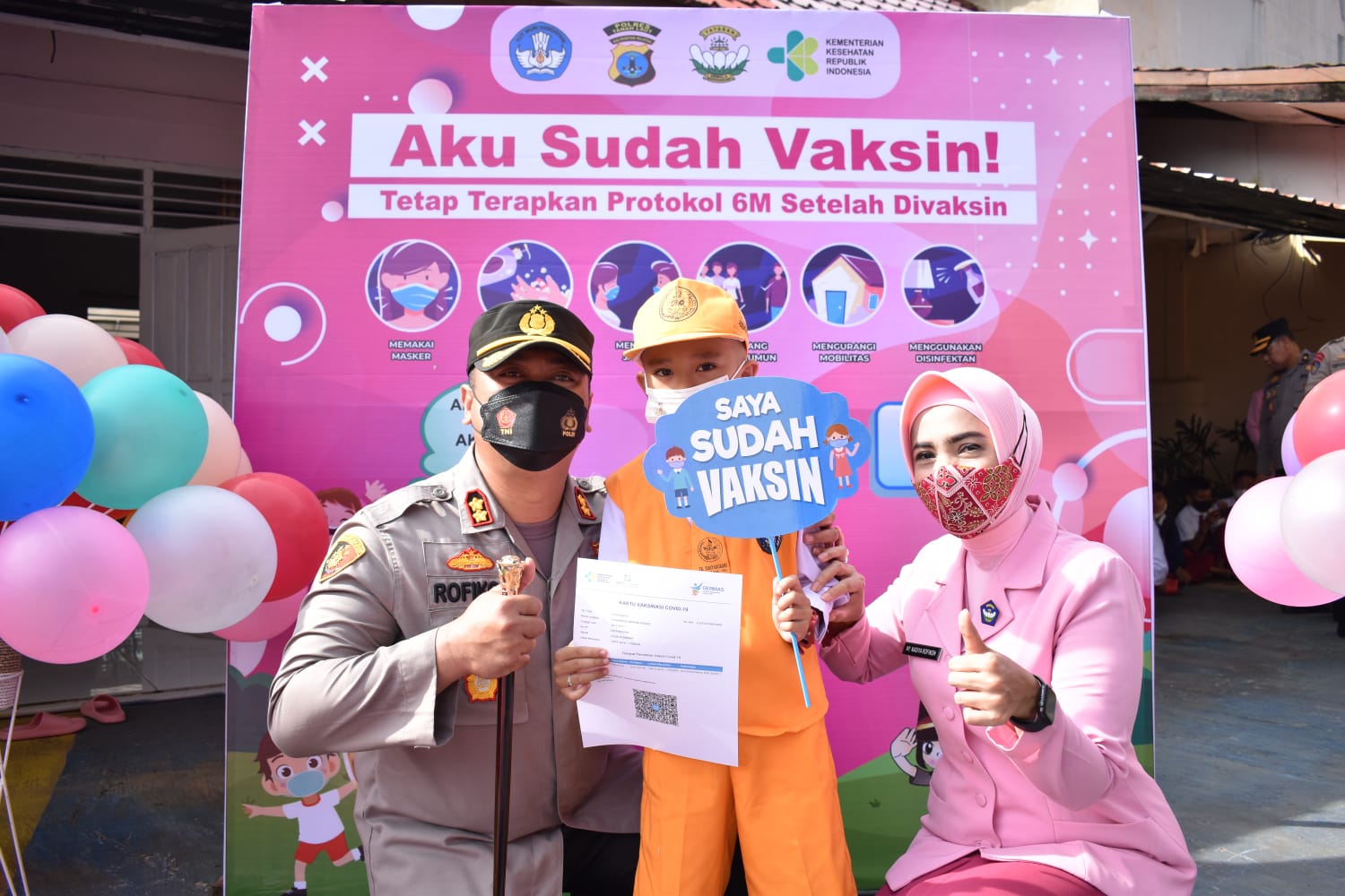 Ketua Yayasan Kemala Bhayangkari Cabang Tanah Laut Ny. Nadiya Rofikoh Yunianto didampingi Kapolres Tanah Laut AKBP Rofikoh Yunianto, S.I.K., memantau langsung kegiatan Gebyar Vaksin Anak usia 6-11 Tahun.
