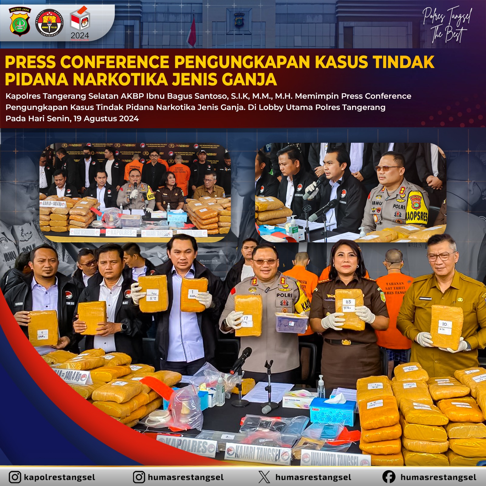 “hari ini polres tangsel melaksanakan konferensi pers pengungkapan narkotika jenis ganja seberat 140,4 Kg, dimana kejadian pada Jumat tanggal 09 Agustus 2024 dengan TKP di Jl. Raya Serang-Bitung, Kel. Kadu Jaya, Kec. Curug, Kabupaten Tangerang”jelas AKBP Ibnu Bagus.