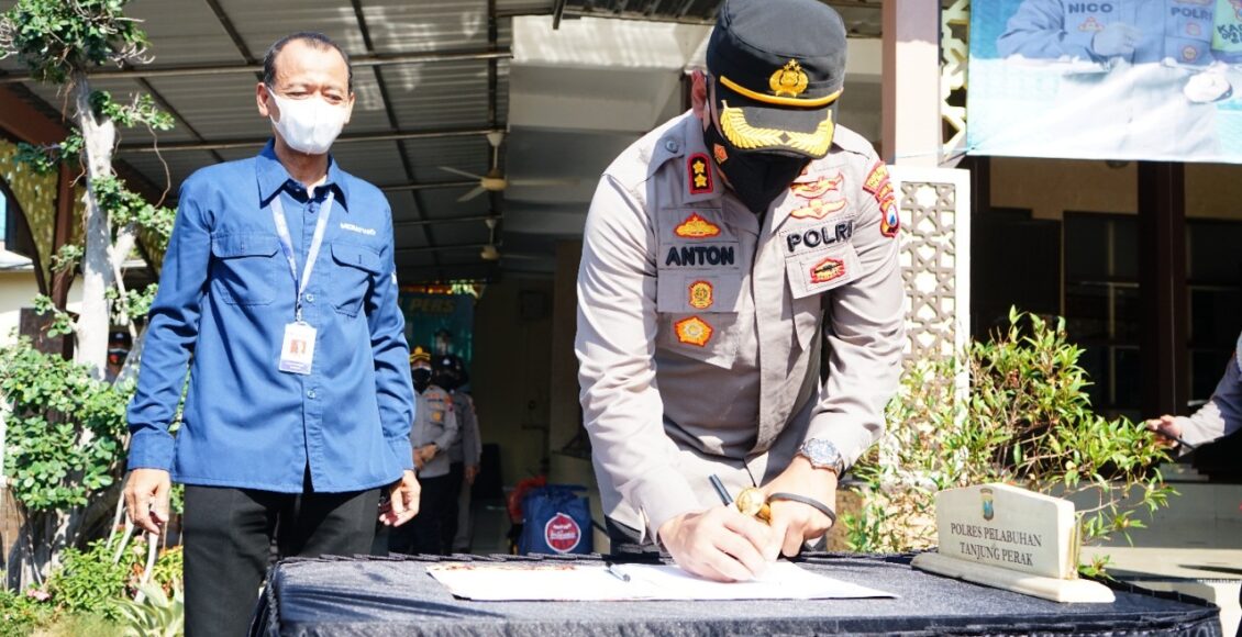 SURABAYA,IKAGAWANEWS.ID –  Kapolres Pelabuhan Tanjung Perak, AKBP Anton Elfrino Trisanto, SH, S.I.K, M.Si memimpin apel penyerahan bantuan Sembako dari PT Meratus di lapangan Mako, Selasa pagi, 31 Agustus 2021.