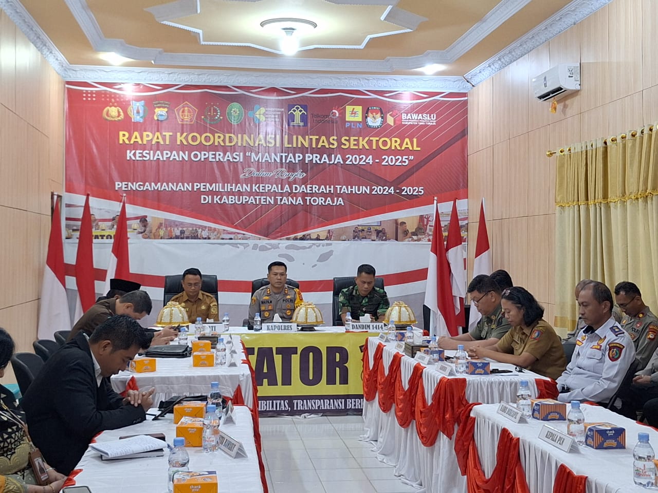 Rapat ini di pimpin Kapolres Tana Toraja dan dihadiri unsur Forum Komunikasi Pimpinan Daerah (Forkopimda) Kabupaten Tana Toraja terdiri dari Bupati Tator yang di wakili Sekda, Dandim 1414/Tator, Kajari Tator, Ketua DPRD Tator dan peserta undangan lainnya antara lain Ketua KPU Tator, Ketua Bawaslu Tator, Kepala instansi Pemerintah dan kepala OPD Kab. Tator, Manager PT Telkom Makale, Kepala PLN, PJU Polres Tator, para Kapolsek Jajaran dan personil Polrtes Tator.