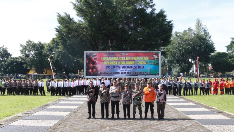 WONOSOBO,ikagawanews.id – Polres Wonosobo melaksanakan upacara gelar pasukan Operasi Lilin Candi 2024 di Alun-Alun Wonosobo, Jumat (20/12/2024). Upacara ini dipimpin langsung oleh Bupati Wonosobo, Afif Nurhidayat, yang membacakan amanat Presiden Prabowo Subianto terkait persiapan pengamanan Natal dan Tahun Baru (Nataru).