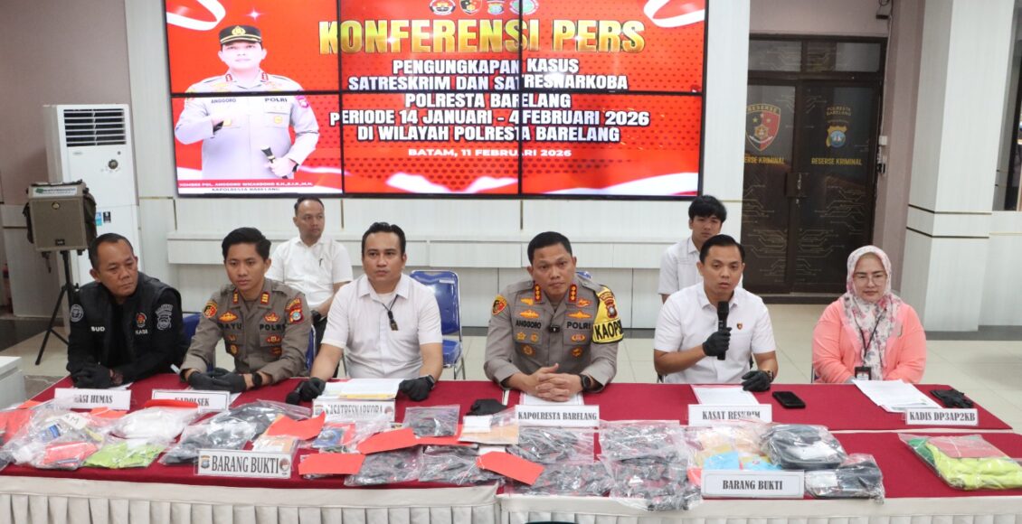 BARELANG,ikagawanews.id – Polresta Barelang menggelar konferensi pers pengungkapan tindak pidana perbuatan cabul yang terjadi di wilayah hukum Polsek Batu Aji. Kegiatan ini dipimpin langsung oleh Kapolresta Barelang Kombes Pol Anggoro Wicaksono, S.H., S.I.K., M.H., didampingi Kasat Reskrim Polresta Barelang Kompol M. Debby Tri Andrestian, S.I.K., M.H.Li., Kasat Resnarkoba Polresta Barelang Kompol Dr. Arsyad Riyandi, S.IP., M.H., Kapolsek Batu Aji AKP Bayu Rizki Subagyo, S.Tr.K., S.I.K., Kasihumas Polresta Barelang AKP Budi Santosa, S.H., serta Kepala Dinas DP3AP2KB Kota Batam Ibu Novi Harmadyastuti. Konferensi pers dilaksanakan di Lobby Polresta Barelang, Rabu, (11/02/2026).