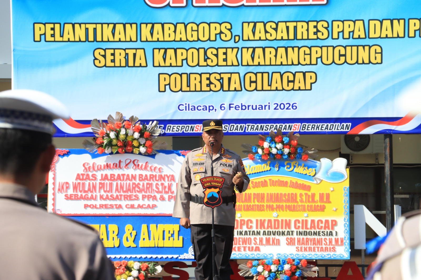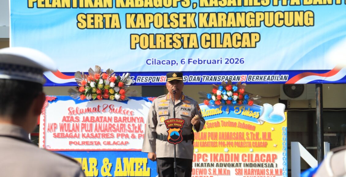 CILACAP, ikagawanews.idPolresta Cilacap melaksanakan pelantikan dan pengambilan sumpah jabatan Kabag Ops, Kasatres PPA dan PPO, serta Kapolsek Karangpucung guna memperkuat pelaksanaan tugas dan fungsi kepolisian di wilayah hukum Polresta Cilacap. Upacara berlangsung di Lapangan Sarja Arya Racana Polresta Cilacap, Jum’at (06/02/2026).