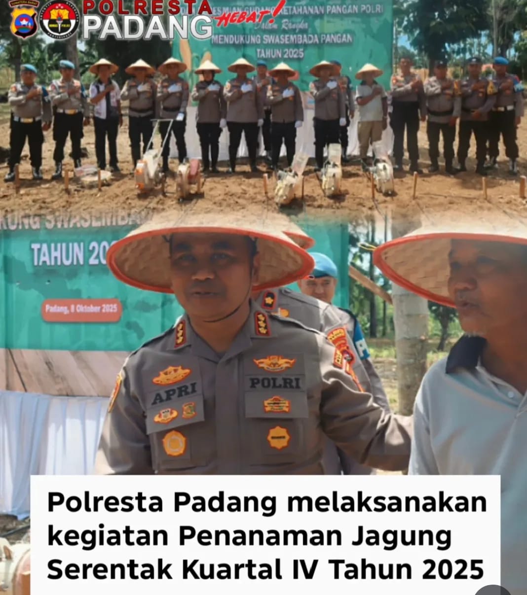 PADANG,ikagawanews.id – Dalam rangka mendukung Program Pemerintah tentang Ketahanan dan Swasembada Pangan Nasional tahun 2025, Polresta Padang melaksanakan kegiatan Penanaman Jagung Serentak Kuartal IV Tahun 2025 di lahan Pertanian Binaan, Rabu (8/10/2025).