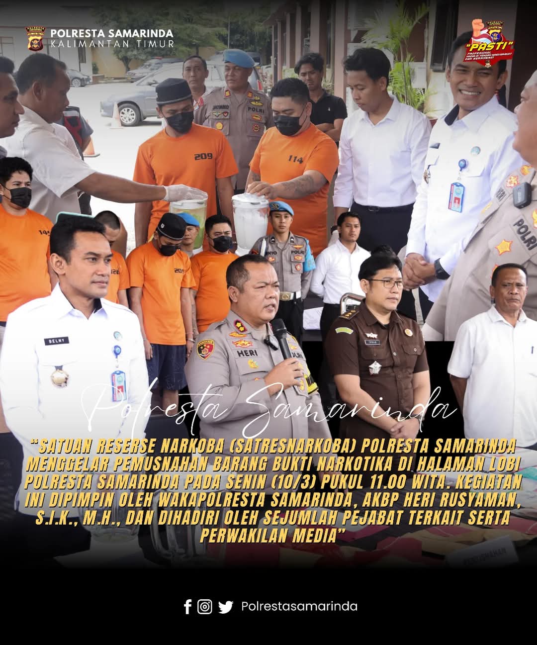Kegiatan ini turut dihadiri oleh Jaksa Negeri Samarinda, Iswan Noor, S.H., M.H, Kepala BNN Kota Samarinda Kombes Pol Belny Warlansyah, S.H., S.I.K., M.H, Kasat Resnarkoba Kompol Bambang Suhandoyo, S.H, serta perwakilan dari Sie Propam, Sie Was, dan Sie Kum Polresta Samarinda.