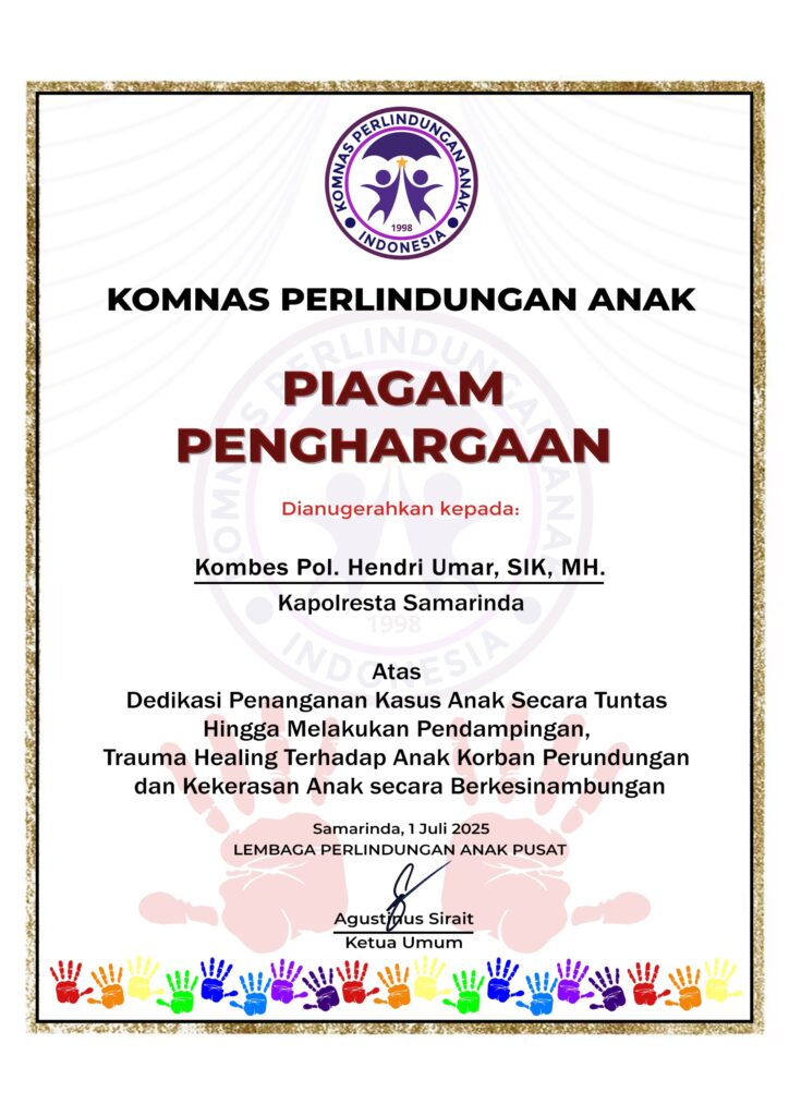 SAMARINDA,ikagawanews.id – Polresta Samarinda melalui Unit Perlindungan Perempuan dan Anak Sat Reskrim Polresta Polresta Samarinda raih penghargaan MURI tentang pemberian psikologis kepada korban Perundungan dan kekerasan anak di lokasi terbanyak.