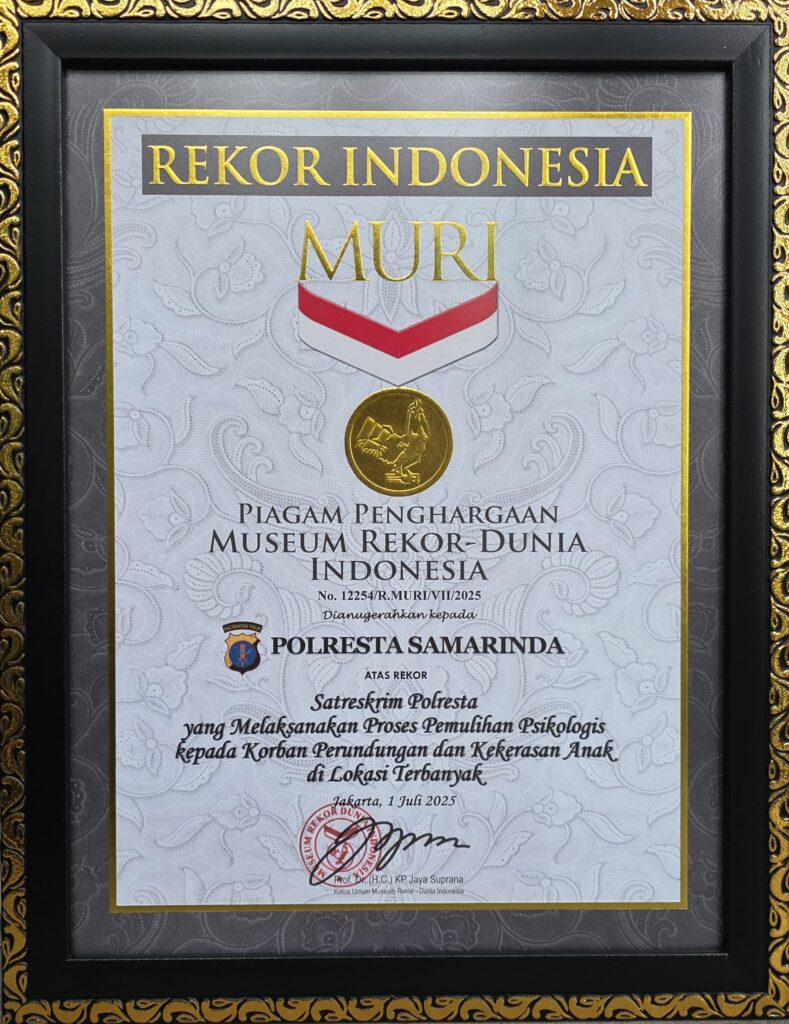 SAMARINDA,ikagawanews.id – Polresta Samarinda melalui Unit Perlindungan Perempuan dan Anak Sat Reskrim Polresta Polresta Samarinda raih penghargaan MURI tentang pemberian psikologis kepada korban Perundungan dan kekerasan anak di lokasi terbanyak.