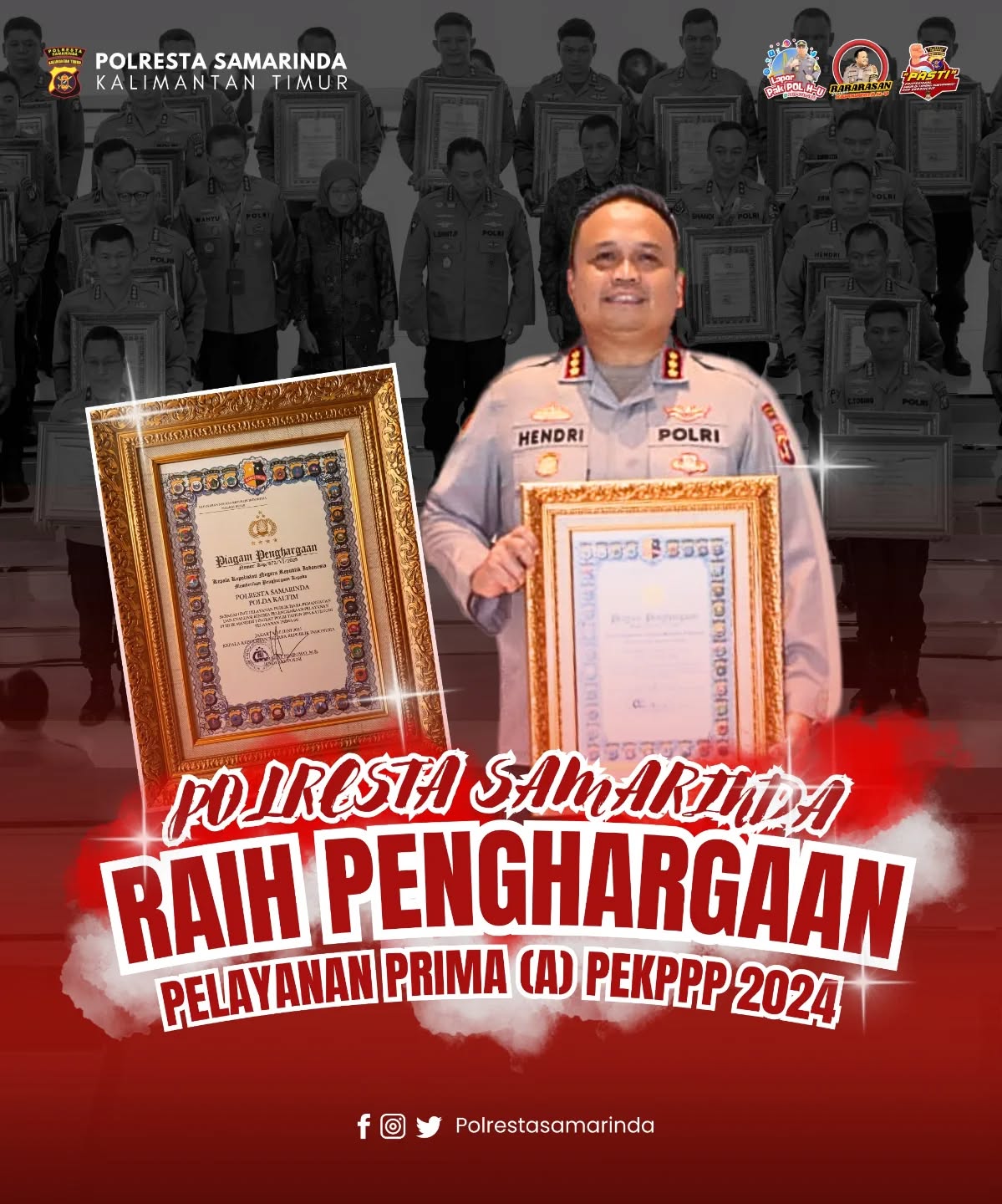 Kapolresta Samarinda Kombes Pol Hendri Umar,S.I.K.,M.H terima penghargaan kategori Pelayanan Prima, hasil dari Pemantauan Evaluasi Penyelenggaraan Kinerja Pelayanan Publik (PEKPPP) Tahun 2024 di lingkungan Polri.