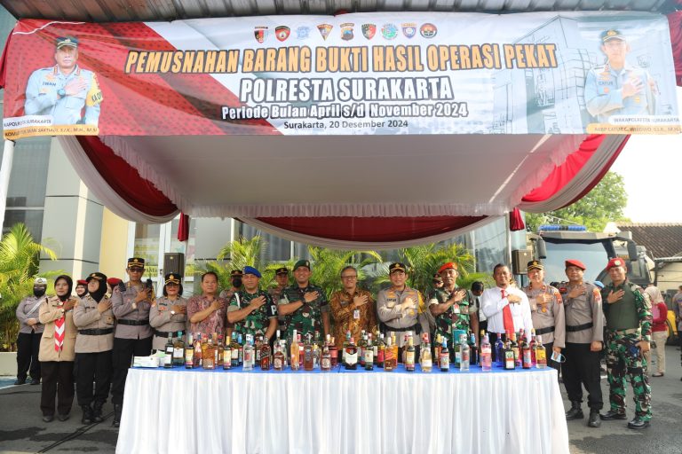 “Pagi hari ini kami Polresta Surakarta melaksanakan acara pemusnahan barang bukti miras dan knalpot tidak standar hasil operasi keselamatan, operasi pekat dan kegiatan rutin yang ditingkatkan dengan sasaran penyakit masyarakat dari April s.d November 2024,” kata Wakapolresta Surakarta AKBP Catur Cahyono Wibowo, SIK.MH, Jumat (20/12/2024).