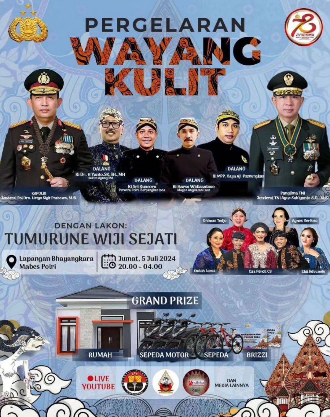 JAKARTA, ikagawanews.id –Kepolisian Negara Republik Indonesia (Polri) masih mengusung kegiatan kebudayaan pertunjukan wayang kulit semalam suntuk dalam rangka Hari Bhayangkara yang tahun ini mengangkat lakon “Tumurune Wiji Sejati”.