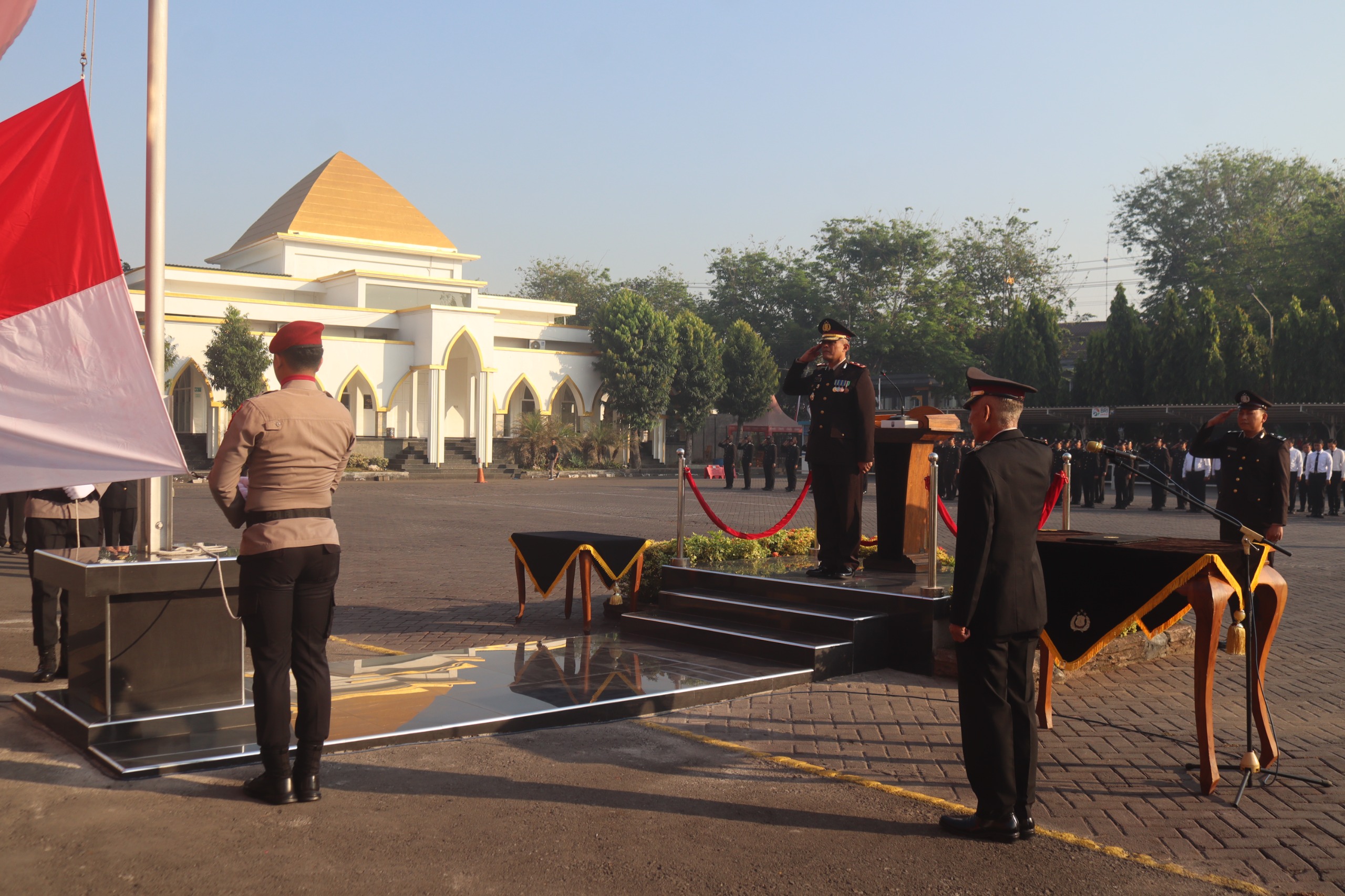 Kapolres Pasuruan AKBP Teddy Chandra, S.I.K., M.Si. melalui Wakapolres Pasuruan Kompol Hari Aziz, S.H. bertindak sebagai Inspektur Upacara, memimpin jalannya prosesi pengibaran bendera merah putih di Polres Pasuruan sedangkan Kapolres Pasuruan mengikuti Upacara penurunan bendera merah putih di alun-alun Bangil bersama Forkopimda Kabupaten Pasuruan.