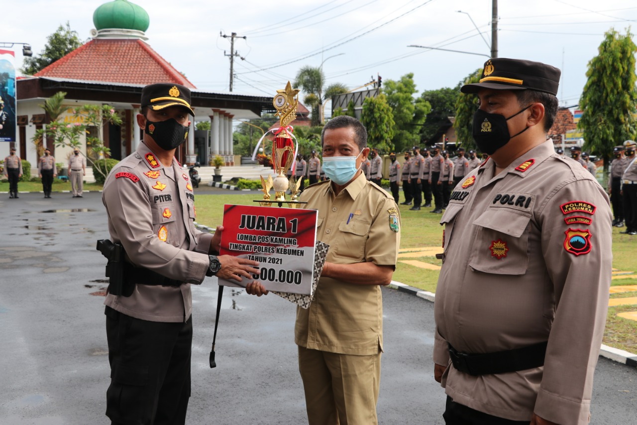 Kapolres Kebumen AKBP Piter Yanottama saat memimpin apel pagi rutin menyerahkan hadiah kepada para pemenang lomba Pos Kamis di halaman Mapolres, Senin (10/1).