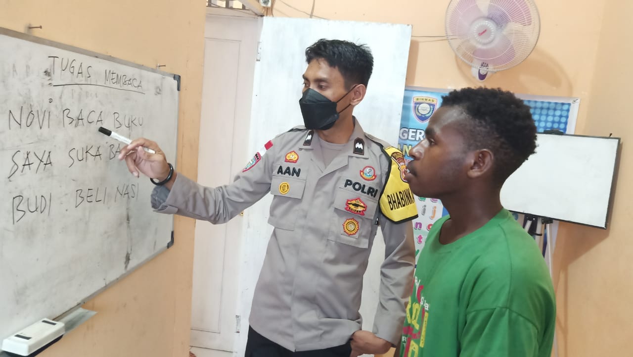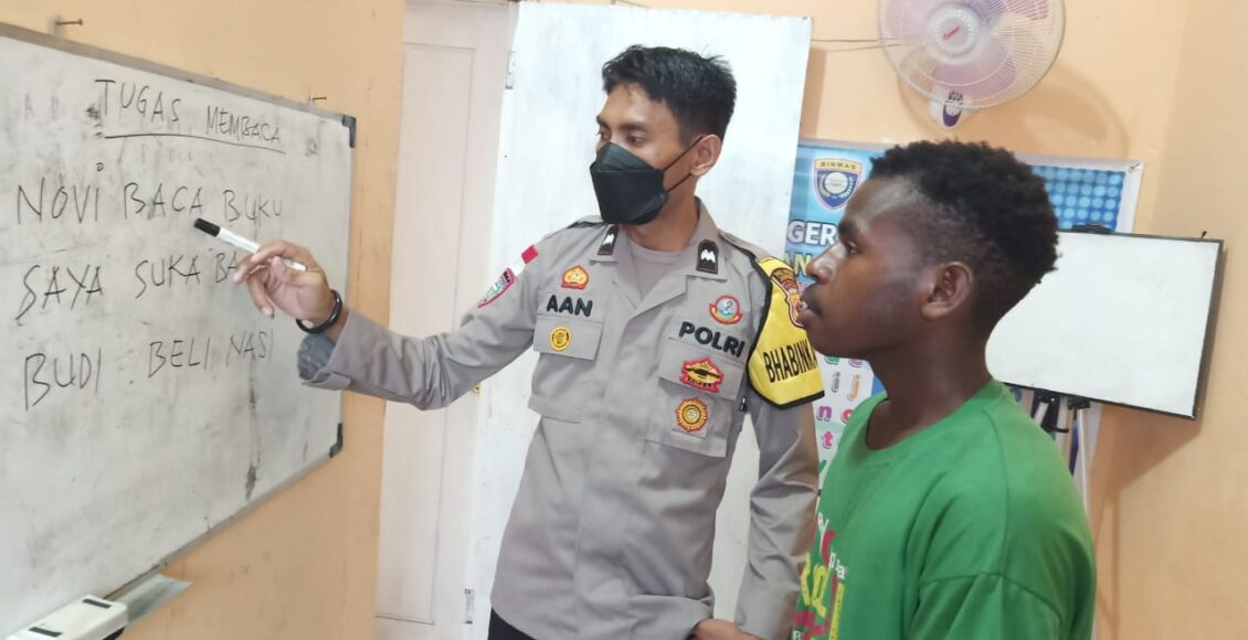 Novi Kogoya (14) yang sudah putus sekolah sejak kelas 3 SD, kini tetap dapat belajar melalui program gerakan baca tulis oleh Polres Jayapura. Novi Kogoya diajari membaca dan menulis oleh Aipda Abang, S.H dan juga Bripka Arobi Umar dengan tulus dan penuh kasih sayang.