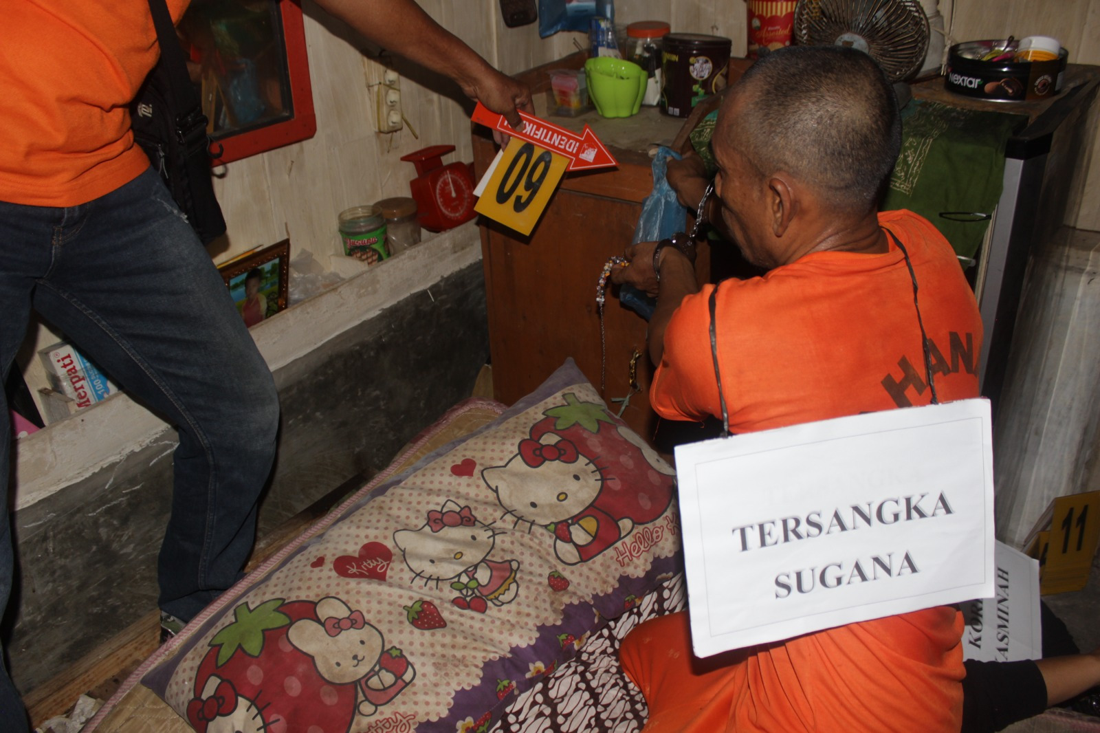 Kapolres Brebes AKBP Guntur Muhammad Tariq melalui Kasat Reskrim AKP Angga Surya Saputra mengungkapkan dalam reka ulang yang berlangsung sekitar 1,5 jam yang disaksikan Kepala Seksi Pidana Umum Kejaksaan Negeri Brebes Nutan Nugroho dan kuasa hukum tersangka, tersangka memperagakan 12 adegan.