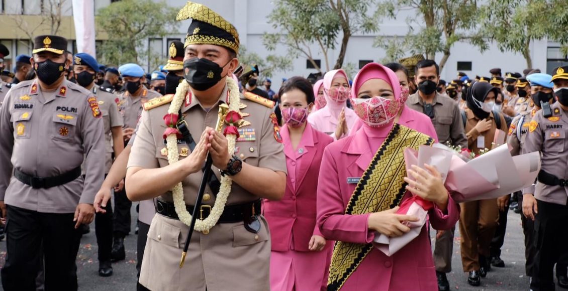 Kedatangan Kapolda Riau Irjen Pol Muhammad Iqbal beserta istri ke Mapolda disambut dengan Jajar Kehormatan oleh personel Polda Riau yang dilanjutkan dengan pengalungan bunga oleh Kapolda yang lama Irjen Pol Agung Setya Imam Effendi di pintu gerbang dan dilanjutkan dengan silat yang diiringi kompang melayu, Senin pagi (3/1/2022) pagi.