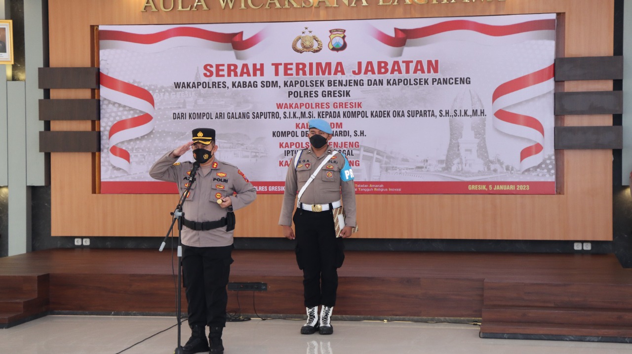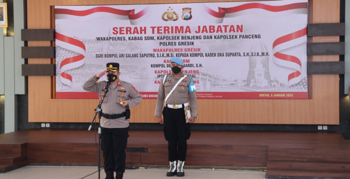 GRESIK ,ikagawanews.id – Rotasi jabatan bergulir di tubuh Polres Gresik kembali bergulir. Polres Gresik menggelar upacara Serah Terima Jabatan (Sertijab) di Aula Wicaksana Laghawa Polres Gresik, Kamis (5-1-2023).