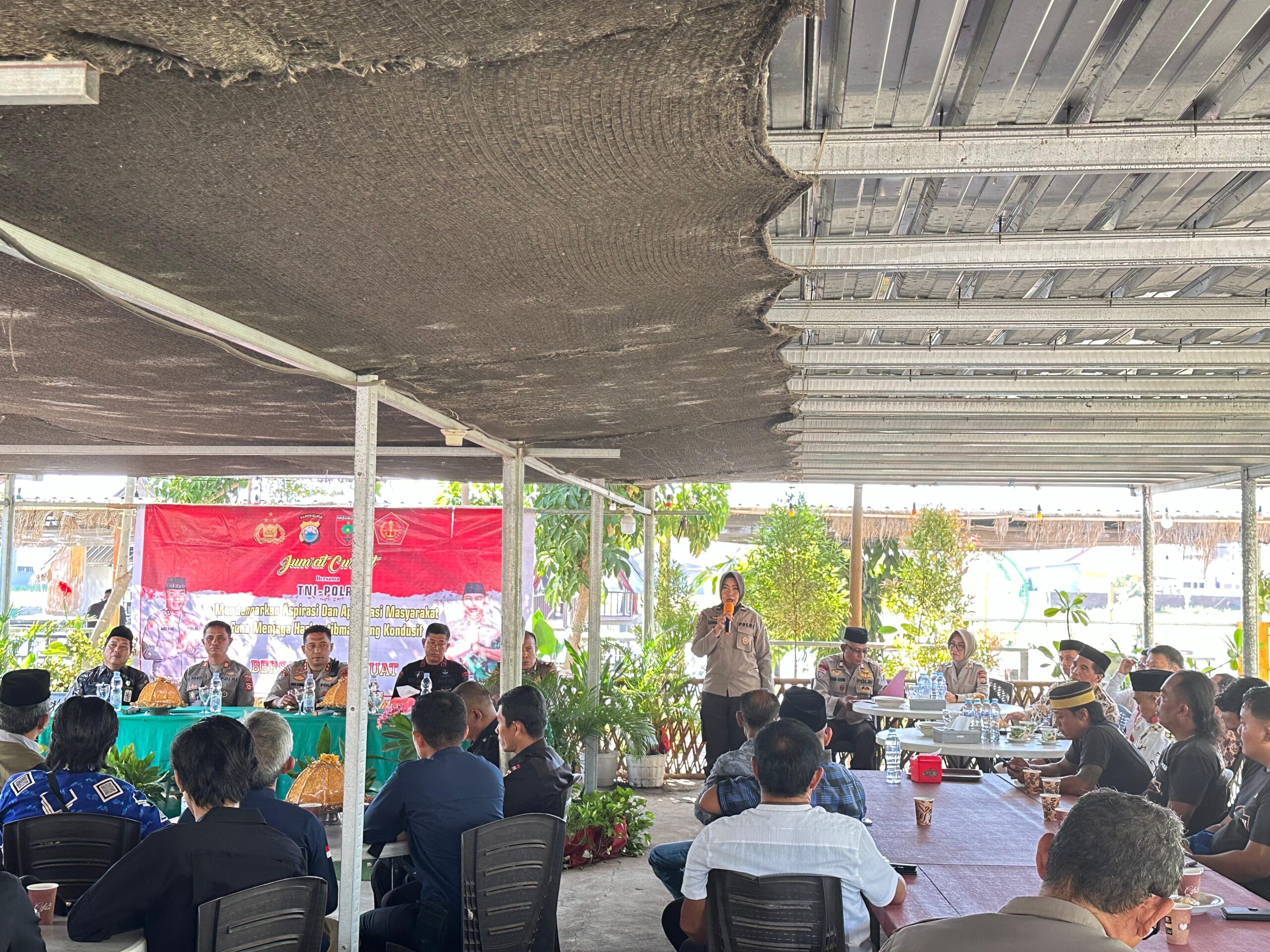 GOWA,ikagawanews.id – Kapolres Gowa AKBP R.T.S Simanjuntak, S.H., S.I.K., M.M., M.I.K diwakili Kasat Binmas AKP Alhabsi, S.H pimpin kegiatan jumat curhat di Balla Rewako tepatnya di Tempat Destinasi Wisata Kuliner Jenetallasa, Kecamatan Pallangga Kabupaten Gowa, Jumat (6/9).