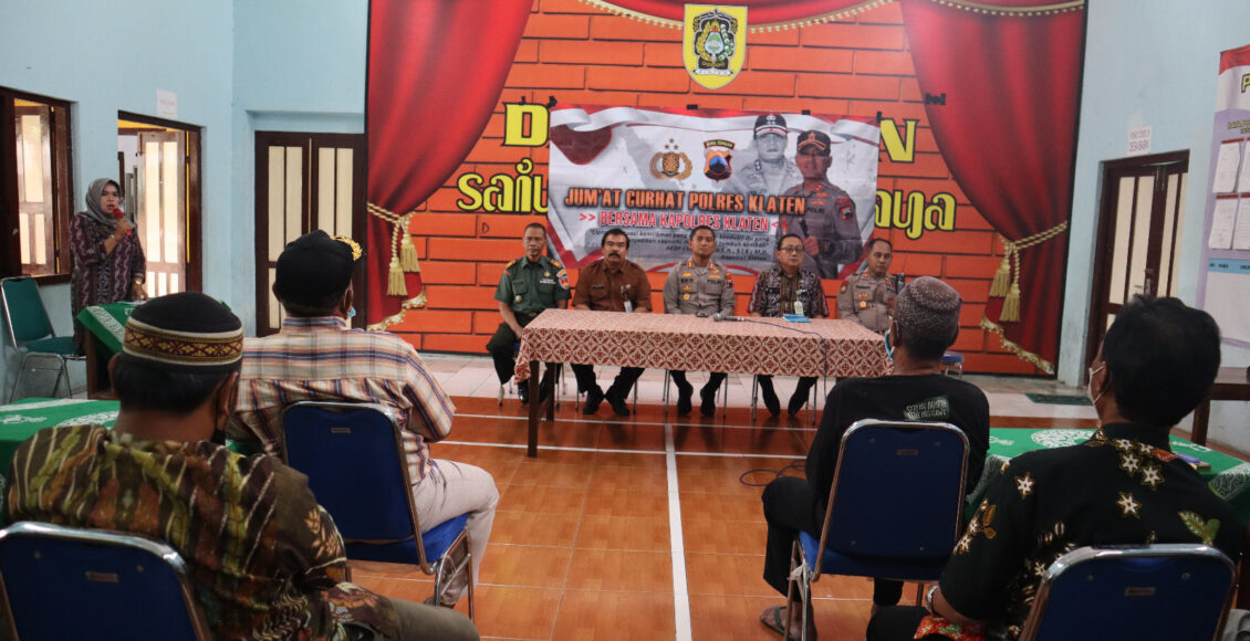 “Jumat Curhat Polres Klaten” merupakan program yang dicetuskan bapak Kapolri untuk memberikan ruang bagi masyarakat berkomunikasi langsung, menyampaikan masukan, aduan atau keluhan dengan para kasatwil Polri. Program ini dilaksanakan mulai dari tingkat Kapolri hingga Kapolsek jajaran.(Red/Hum)