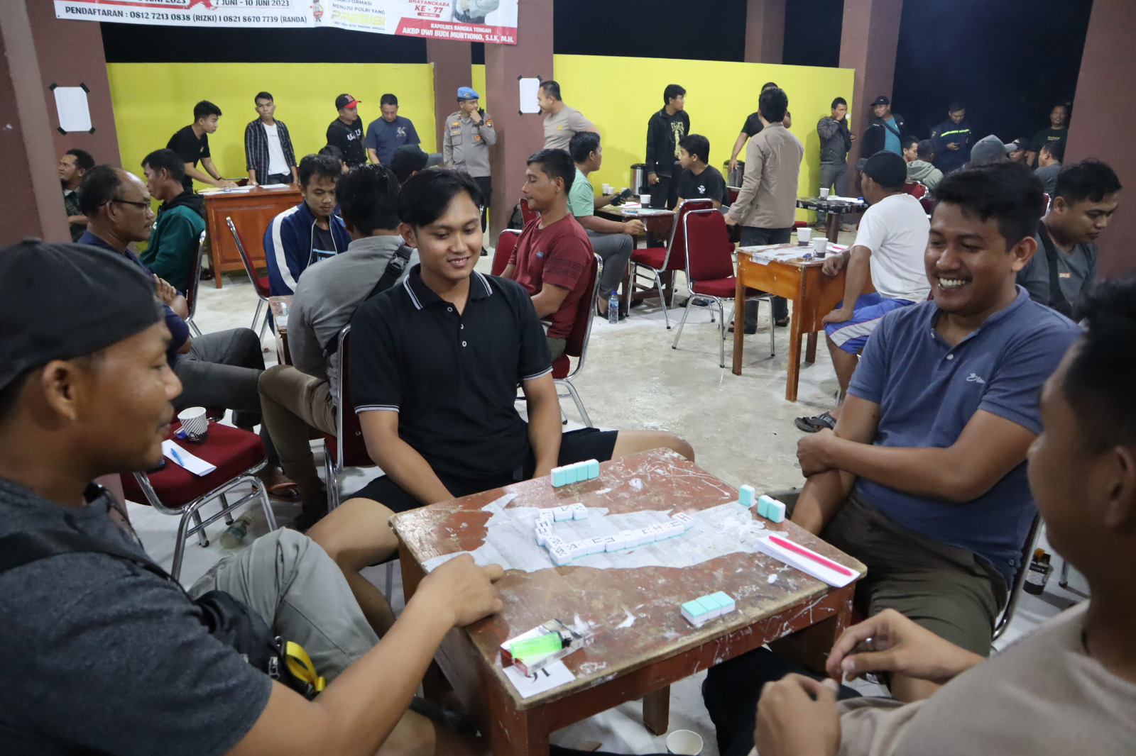 Terpantau ratusan peserta yang terdiri dari 64 pasang atau tim akan bertanding diperlombaan gaple yang digelar di Polres Bangka Tengah dan tim yang akan bertanding dibagi menjadi 4 pool yang mana para peserta berasal dari kalangan masyarakat umum maupun TNI/Polri.