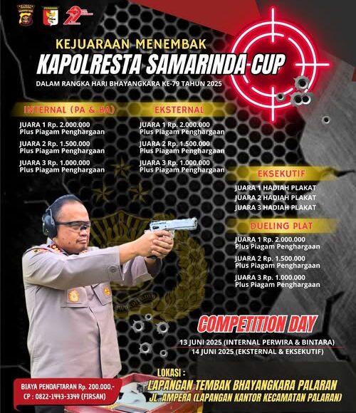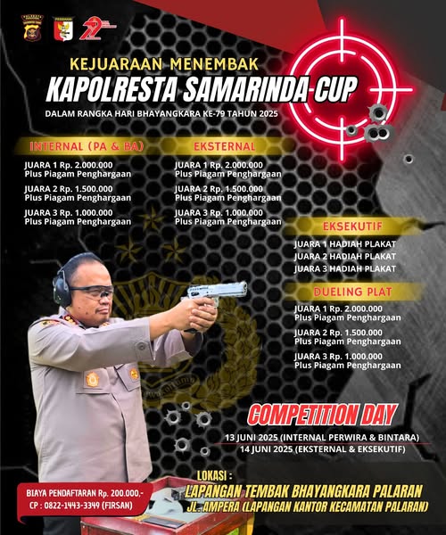 Samarinda – Halo Sobat Polri !!!Dalam rangka menyambut Hari Bhayangkara ke-79 Polresta Samarinda akan menggelar lomba menembak yang dilaksanakan di Lapangan Tembak Bhayangkara Palaran Jl.Ampera (Lapangan Kantor Kecamatan Palaran) pertanggal 13-14 juni 2025.