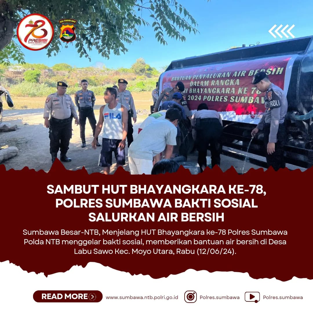 Sumbawa Besar(NTB),ikagawanews.id – Menjelang HUT Bhayangkara ke-78 Polres Sumbawa Polda NTB menggelar bakti sosial, memberikan bantuan air bersih di Desa Labu Sawo Kec. Moyo Utara, Rabu (12/06/24).