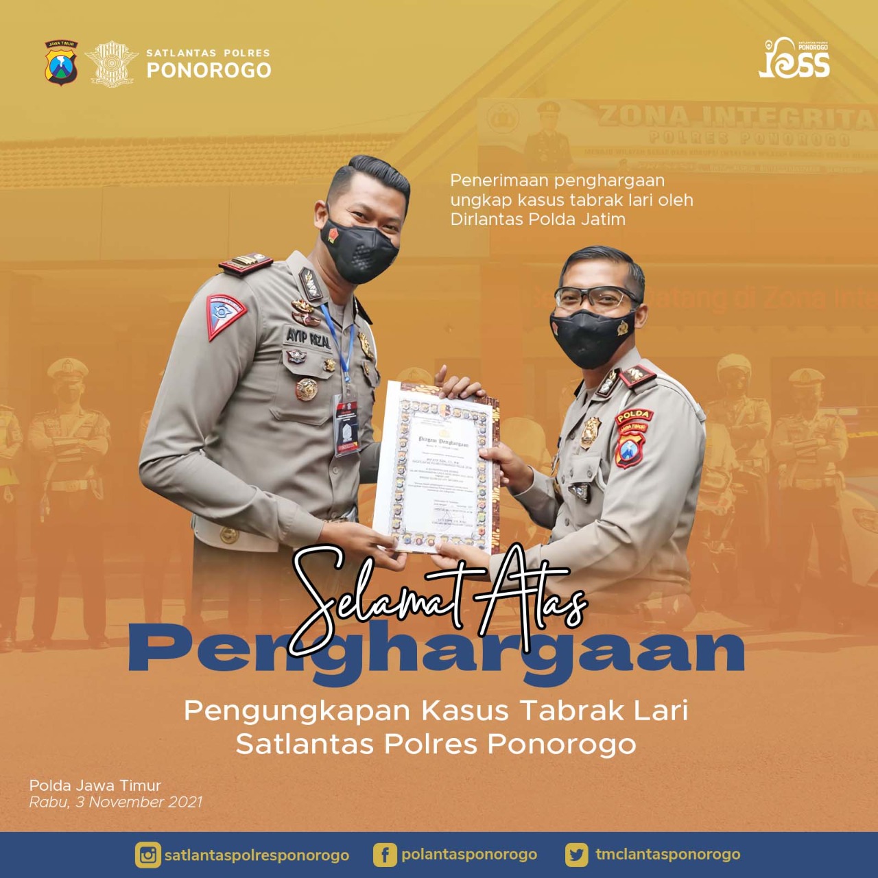“Alhamdulillah, penghargaan ini atas kinerja anggota Satlantas Polres Ponorogo dalam pengungkapan kasus tabrak lari yang terjadi pada rentan waktu Juli hingga Oktober 2021,” Ujarnya