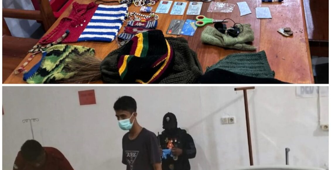 “Kami juga mengamankan sejumlah barang bukti di TKP penindakan antara lain 5 buah parang, 1 pucuk senapan angin, 2 buah busur panah, 1 bilah pisau dengan gagang berwarna merah, 1 bilah samurai dengan sarung terbuat dari kayu berwarna merah, 1 bilah pisau dan HP berbagi jenis serta aksesoris lainya yang bermotif Bintang Kejora,” jelas Bayu.