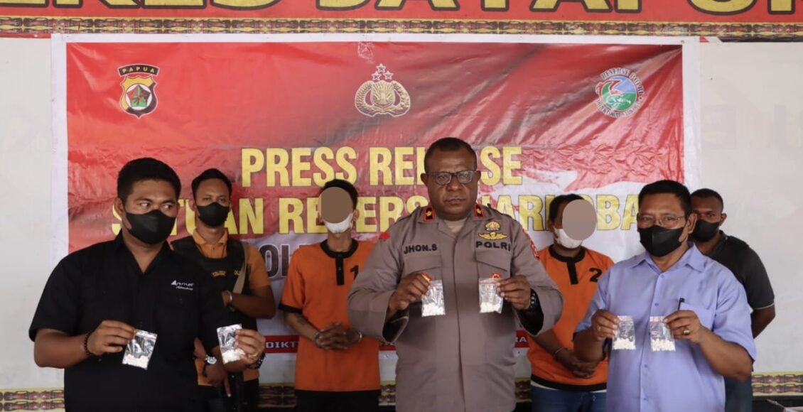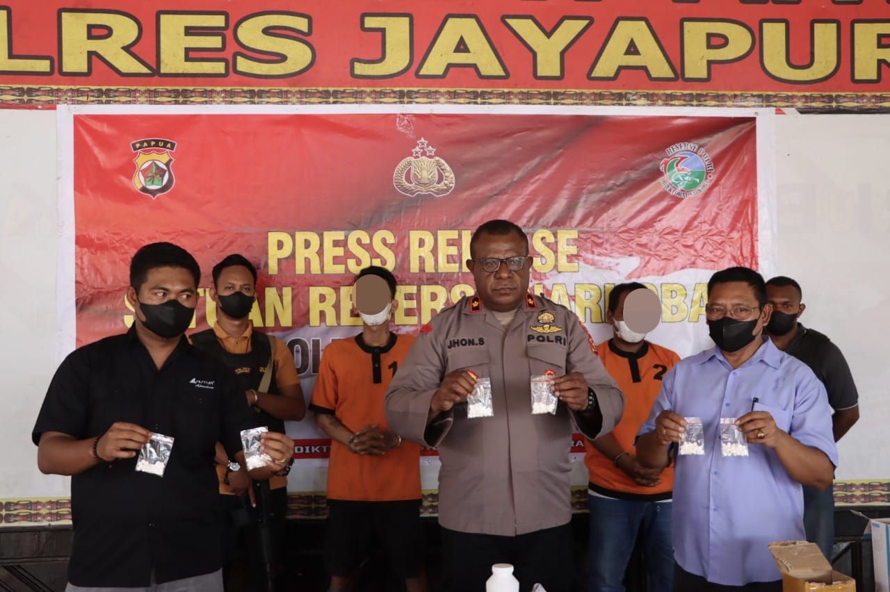 Press conference yang disampaikan langsung Wakapolres Jayapura Kompol Joni Samonsabra, SH., MH didampingi Kasat Narkoba AKP Alfrit B. Nadek, SH, KBO Narkoba Ipda Aswan Syarif, SH dan Kasie Humas Iptu Priyono dengan menghadirkan 2 orang tersangka berinisial HS (42) dan T (24) berikut barang bukti 1070 pil koplo berlogo Y yang positif mengandung Trihexyphenidly (obat keras) sesuai dengan hasil pemeriksaan ahli bidang laboratorium forensik Polda Papua.