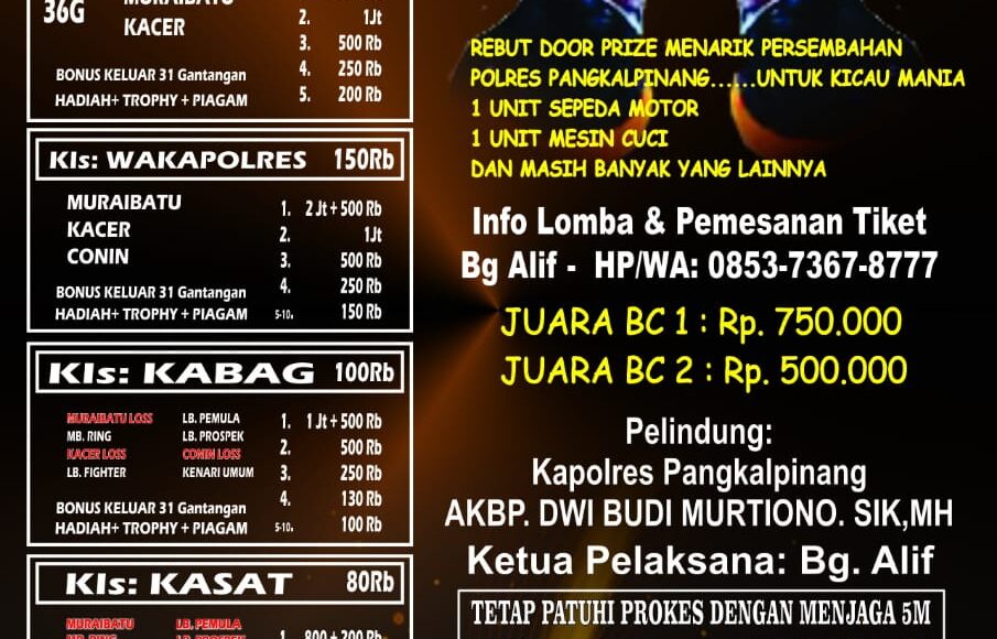 Rebut Door Prize menarik persembahan Polres Pangkalpinang, untuk Kicau Mania 1 Unit Sepeda Motor, Unit Mesin Cuci dan masih banyak lagi hadiah lainnya. Pelaksaan Festival dan Lomba Seni Burung Berkicau pada hari Minggu tanggal 12 Juni 2022.