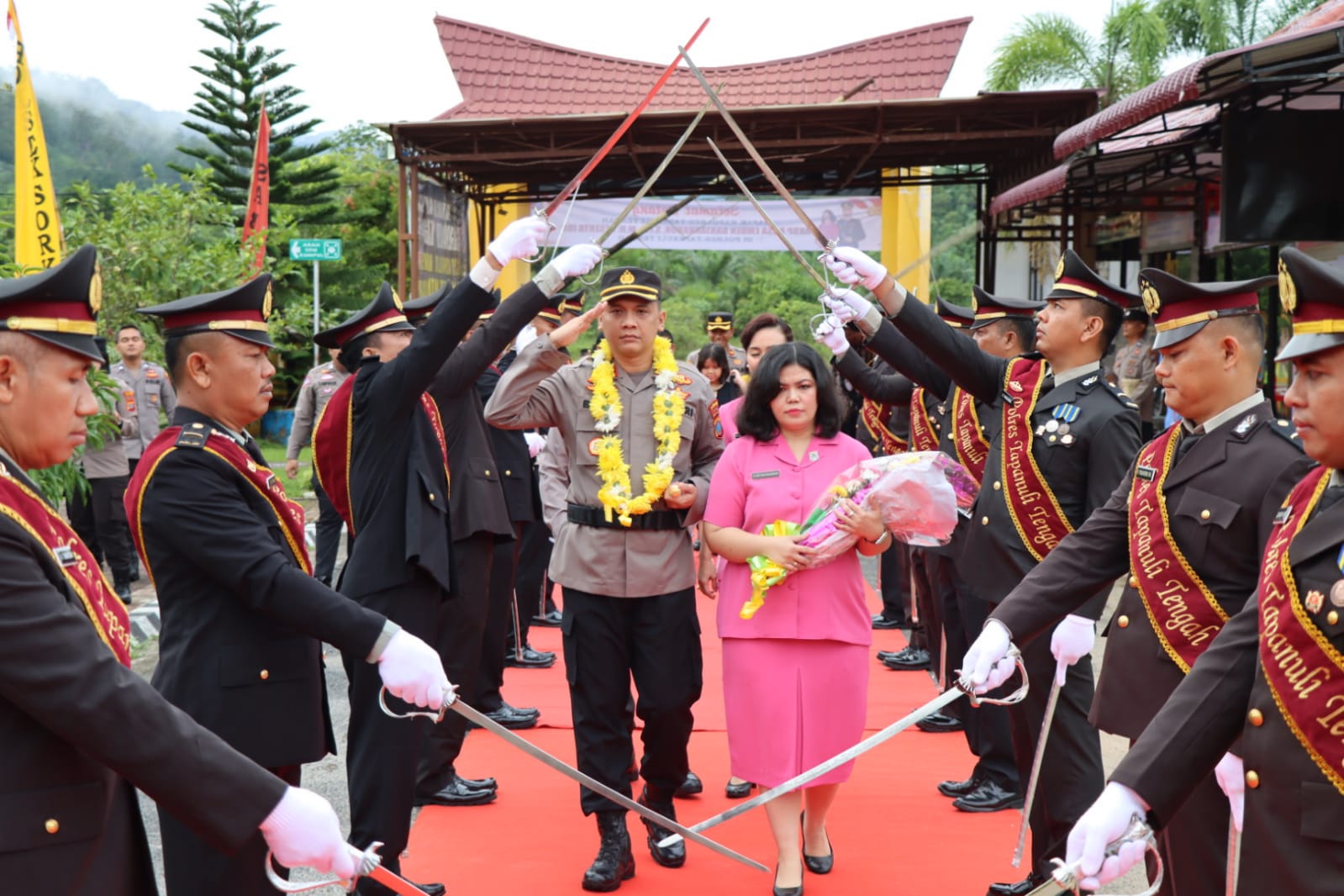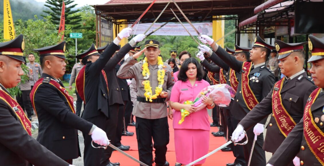 TAPTENG,ikagawanews.id – Setelah serah terima jabatan (Sertijab) di Polda Sumut, Kapolres Tapteng AKBP Basa Emden Banjarnahor dan istri tiba di Mapolres Tapteng, Senin (10/7/2023) pagi disambut tradisi Pedang Pora oleh personel Polres Tapteng.