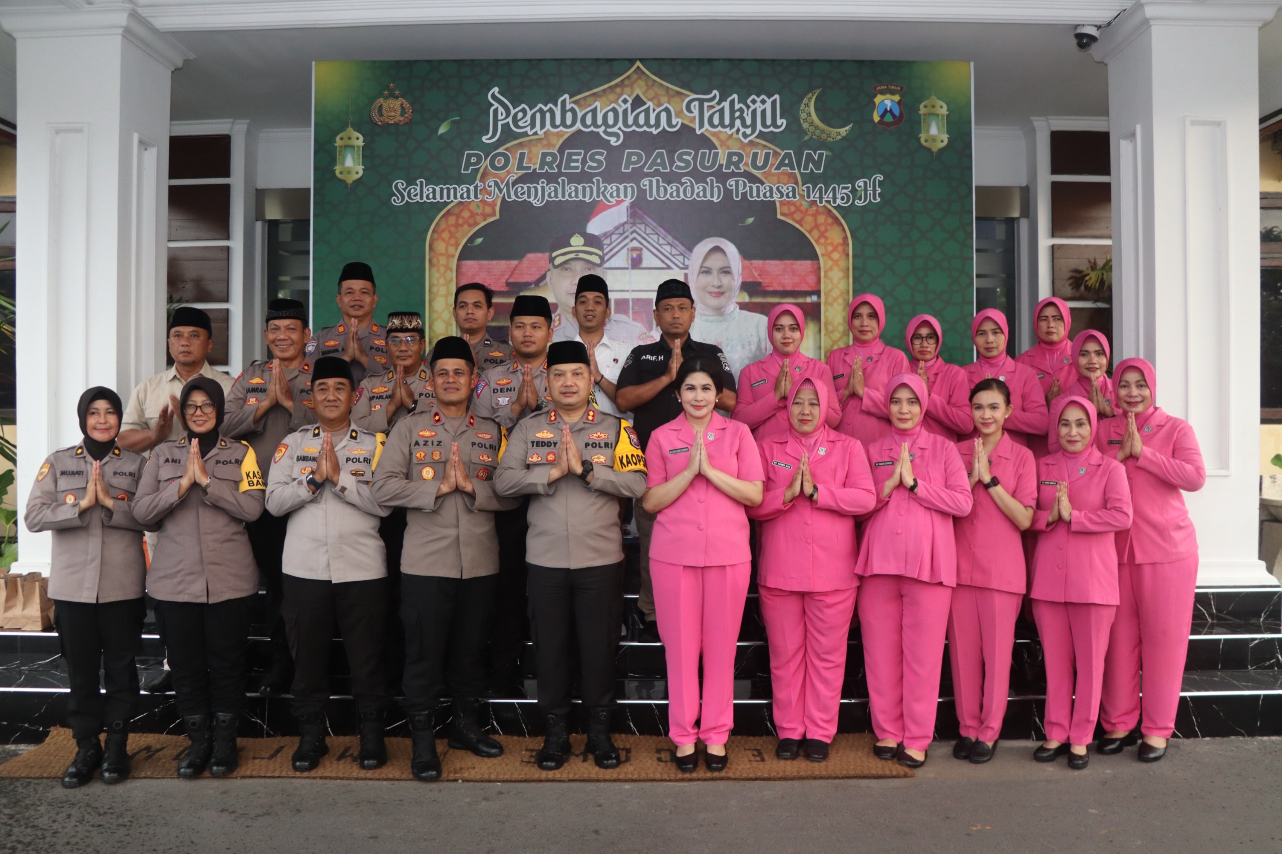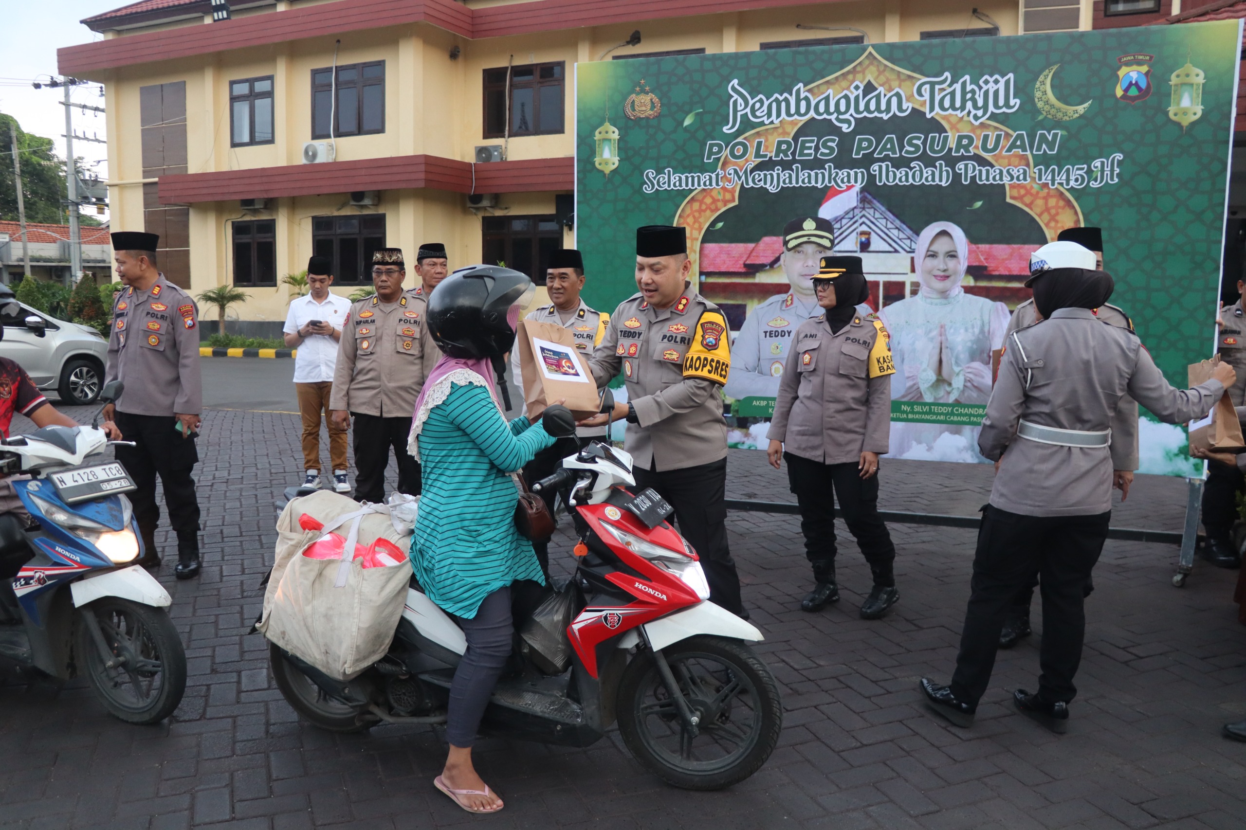 Pembagian takjil tersebut langsung dilakukan oleh Kapolres Pasuruan AKBP Teddy Chandra didampingi Ketua Bhayangkari Cabang Pasuruan NY Silvi Teddy Chandra beserta pejabat utama Polres Pasuruan.