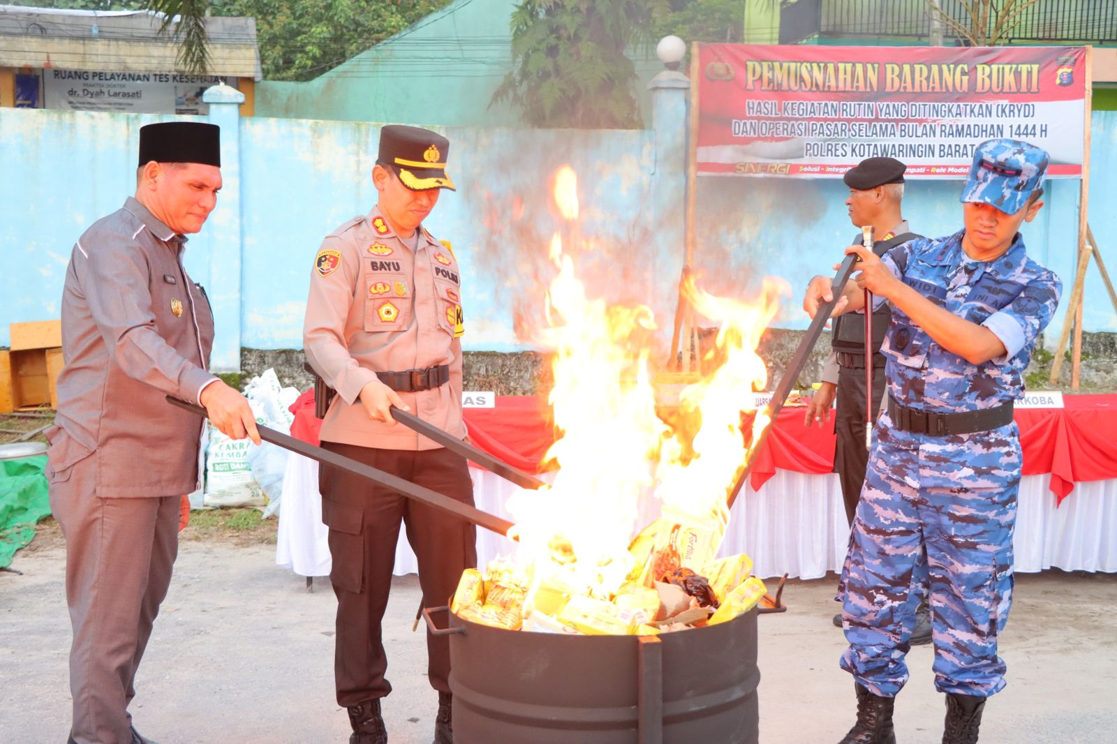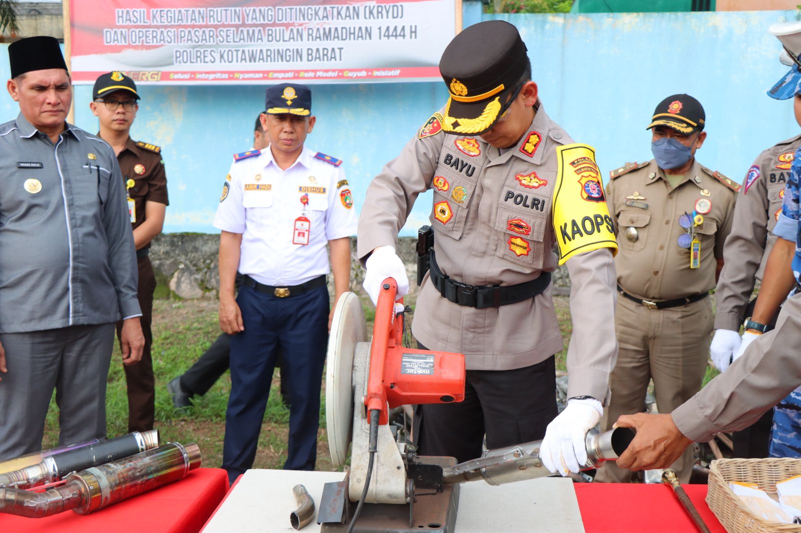 KOTAWARINGIN BARAT,ikagawanews.id – Setelah apel gelar pasukan, Kapolres Kotawaringin Barat AKBP Bayu Wicaksono,SH.,SIK.,M.Si bersama PJ Bupati, unsur Forkopimda dan tamu undangan melakukan pemusnahan terhadap beberapa barang / benda hasil dari Kegiatan Rutin Yang Ditingkatkan (KRYD) selama berjalannya Bulan Ramadhan di Lapangan SatlantasSenin 17 April 2023 .