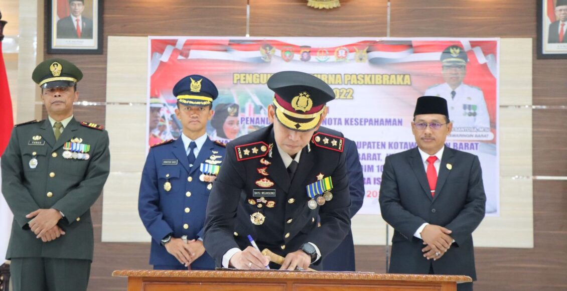 KOTAWARINGIN BARAT,ikagawanews.id – Setelah pelaksanaan upacara Hari Lahir Pancasila, Kapolres Kotawaringin Barat AKBP Bayu Wicaksono,SH.,SIK.,M.Si beserta unsur Forkopimda mengikuti Pengukuhan Purna Paskibraka Th 2022 dan Penandatanganan MOU pelaksanaan tugas pemerintahan umum,Kamis 1 Juni 2023.