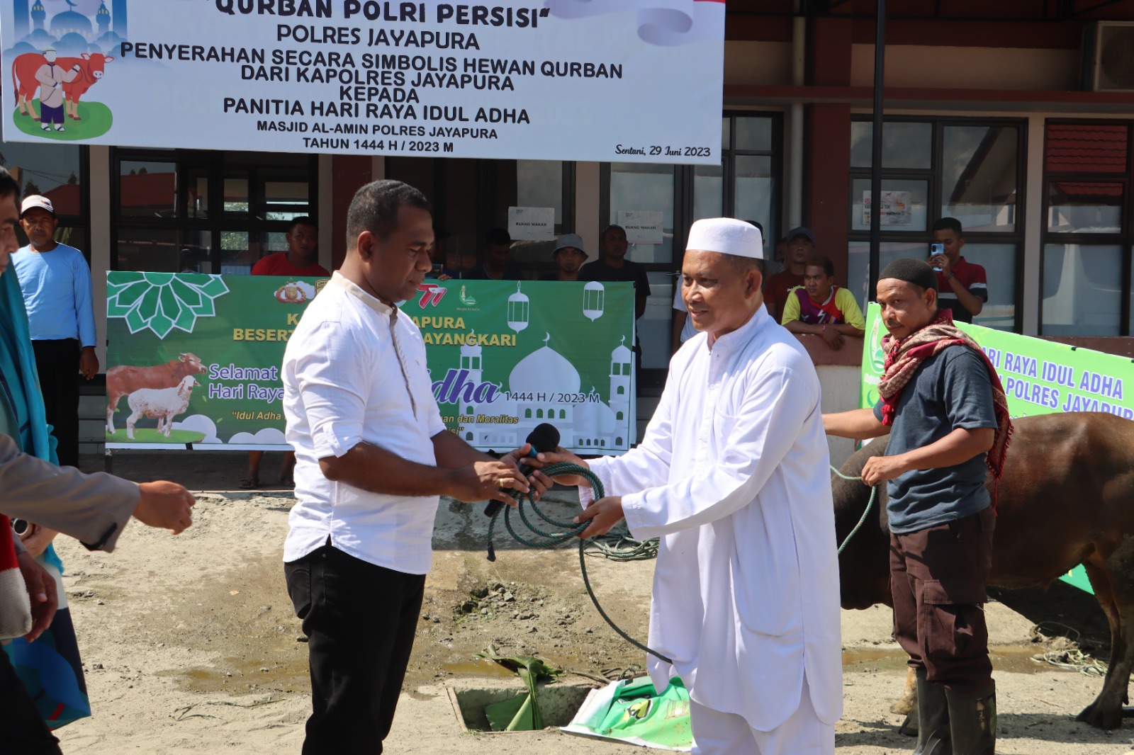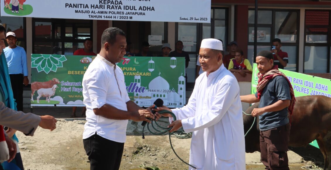 Kapolres Jayapura AKBP Fredrickus W.A Maclarimboen, S.IK., MH yang didampingi Ketua Bhayangkari Cabang Jayapura Ny. Deby Fredrickus Maclarimboen, beserta pejabat utama Polres secara simbolis menyerahkan sapi Qurban yang diterima langsung AKP Purwadi selaku Ketua Panitia Hari Raya Idul Adha 1444 H Masjid Al Amin Polres Jayapura.