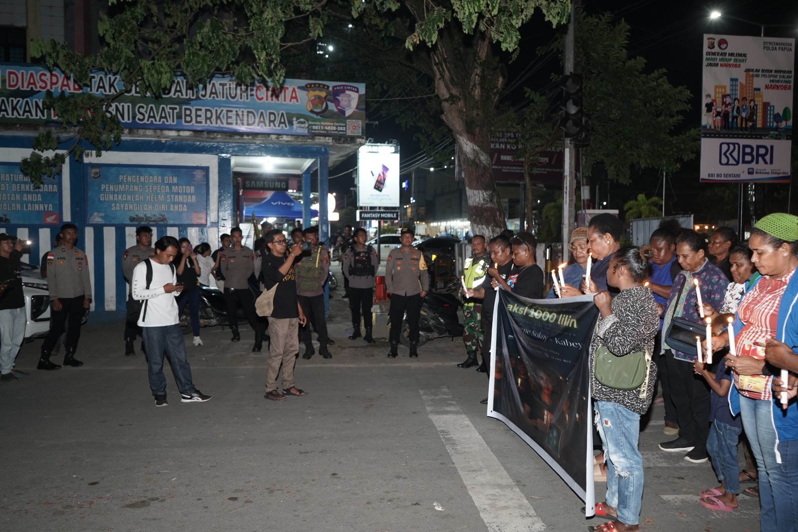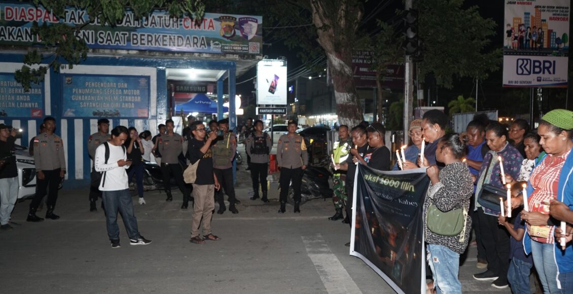 Sentani,ikagawanews.id – Polres Jayapura melaksanakan pengamanan kegiatan aksi solidaritas 1000 lilin yang digelar masyarakat sebagai bentuk penghormatan dan duka atas meninggalnya Almarhumah Irene Sokoy. Aksi ini berlangsung pada Jumat malam di sepanjang Jalan Bandara Sentani, dan dihadiri puluhan warga yang datang untuk menyampaikan dukungan moral kepada keluarga almarhumah, Kamis (27/11).
