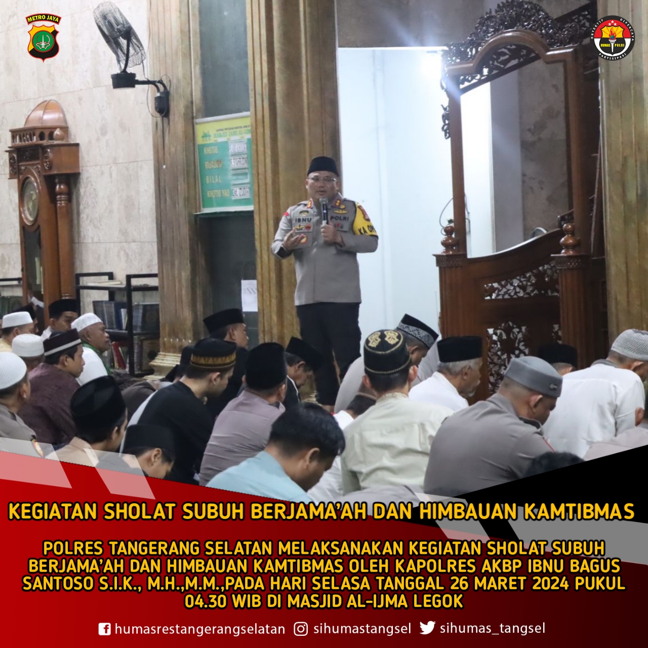TANGSEL, ikagawanews.id – Kapolres Tangsel AKBP Ibnu Bagus Santoso, S.I.K., M.M., M.H. kembali melaksanakan program subuh keliling yaitu shalat subuh berjamaan di masjid masjid wilayah hukum Polres Tangsel secara bergiliran, Selasa (26/3) subuh.