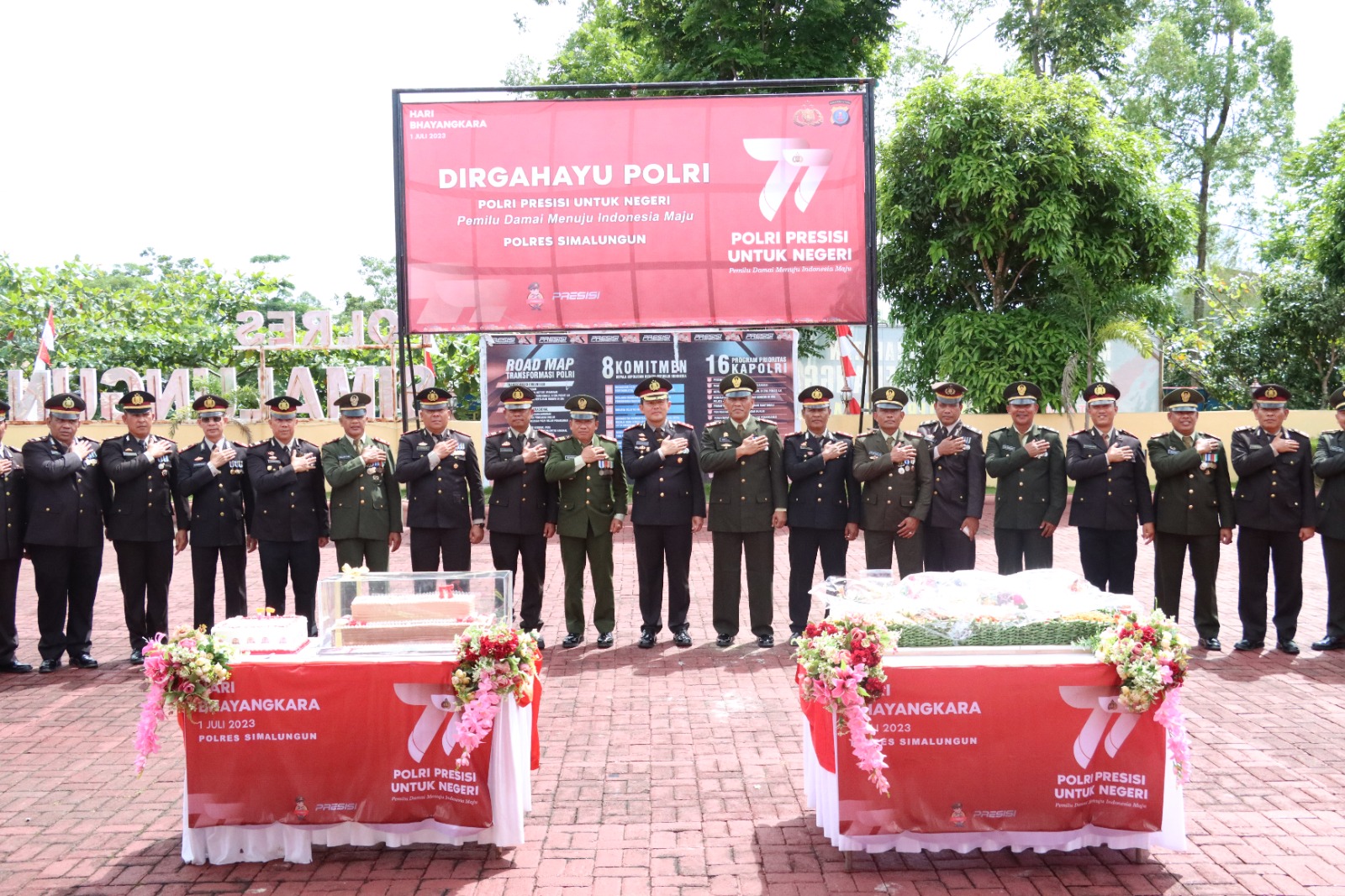 Kapolres Simalungun AKBP Ronald Fredy C Sipayung, S.H., S.I.K., M.H., bersama undangan VIP yang hadir seperti Bupati Simalungun Radiapoh Hasiholan Sinaga, SH., diwakilkan oleh Wakil Bupati Simalungun H. Zony Waldi .S.Sos., M.M., Danrindam I/BB Kol Inf Charles B P Sagala, SH, MIP., Dandim 0207/SML Letkol Inf Hadrianus Yossy, S.B, S.I.Pem.,M.Han., Ketua DPRD Simalungun Timbul J.Sibarani., Kepala Kejaksaan Negeri Simalungun Irfan Hergianto., SH., MH., tampak hadir dalam acara Syukuran Hari Bhayangkara ke 77.