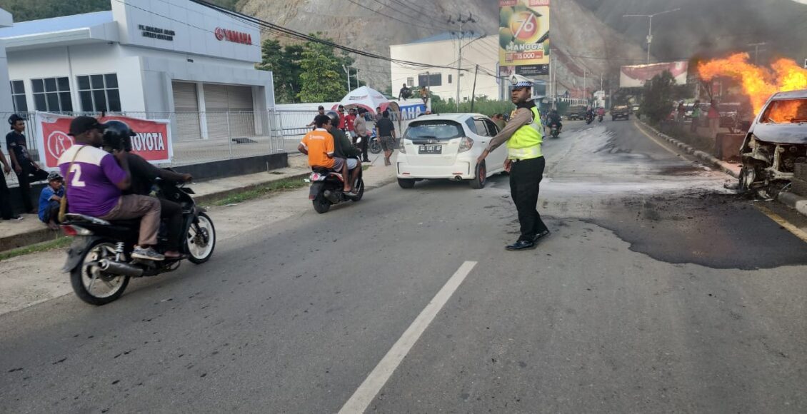 Lebih Kasat Lantas mengatakan mobil tersebut awalnya melaju dari arah Abepura tujuan Sentani tepat di depan dealer Yamaha mobil menabrak kotak kabel tiang listrik yang berada ditengah jalan/pembatas jalan sehingga mengeluarkan api dan menghanguskan mobil tersebut.