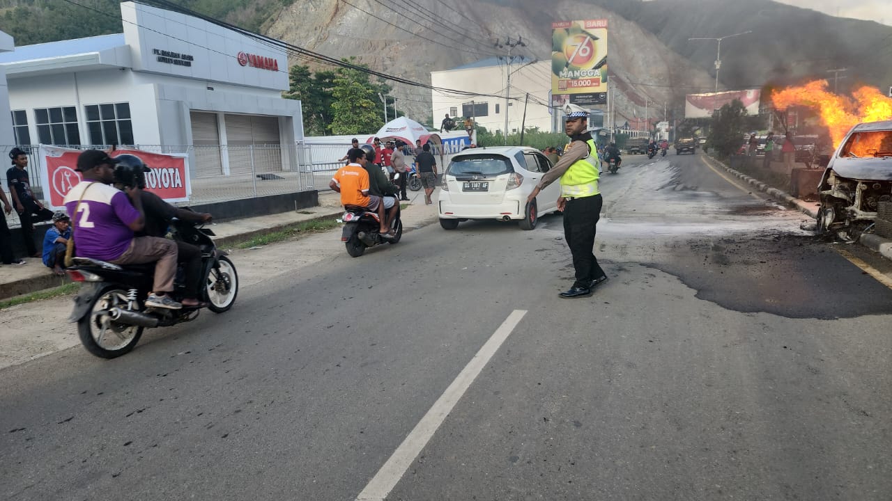 Tabrak Tiang Lampu Jalan, Minibus Hangus Terbakar di Jalan Raya Sentani