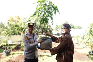 Sebelum penanaman pohon, dilakukan penyerahan bibit pohon kelengkeng secara simbolis dan penyerahan cindera mata oleh Kapolresta Banyumas kepada Drs. Bagus Hermono, M.Pd., M.M.(PID Presisi Humas Polresta Banyumas).