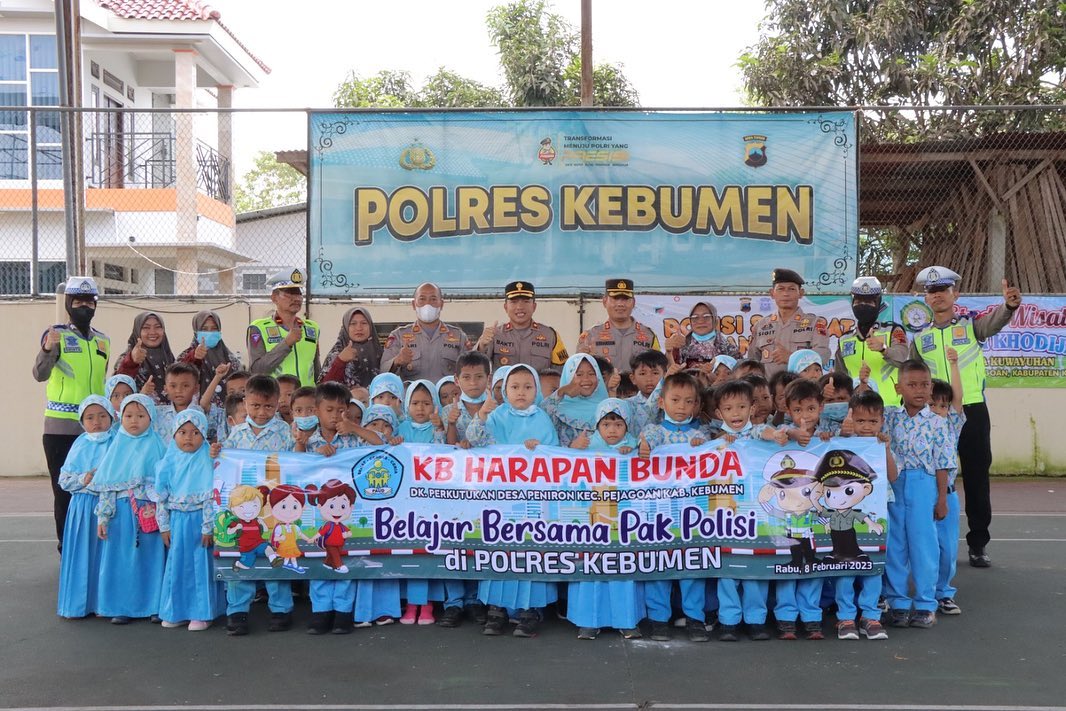 Seperti yang dilakukan oleh Polres Kebumen, kepada guru dan murid-murid Kelompok Bermain Harapan Bunda, Desa Peniron, Kecamatan Pejagoan dan TK Siti Khodijah, Desa Kuwayuhan, Kecamatan Pejagoan saat kegiatan polisi sahabat anak (Polsanak) di Polres Kebumen, Rabu 8 Februari 2023.