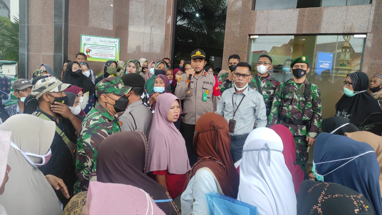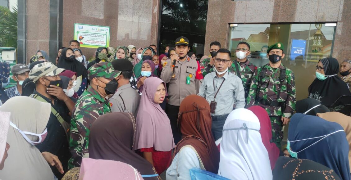 LHOKSEUMAWE,ikagawanews.id – Tidak patuhi protokol kesehatan (Prokes0 COVID-19, personel Polres Lhokseumawe bersama sejumlah TNI setempat membubarkan kerumunan antrean masyarakat yang hendak mengambil bantuan modal usaha di Bank Aceh Cabang Lhokseumawe, Rabu (29/9/2021).