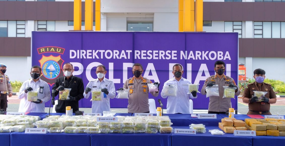 Kapolda Riau Irjen Agung Setia saat menggelar konferensi pers bersama Kepala BNNP Riau Brigjen Robinson Siregar, Dir Resnarkoba Kombes Victor Siahaan, Kabid Humas Kombes Narto, Kabid Labfor AKBP Yani Nursyamsu serta perwakilan dari Kejaksaan Tinggi Riau dan Kejaksaan Negeri Bengkalis menegaskan tidak ada ruang bagi peredaran narkoba di provinsi Riau.