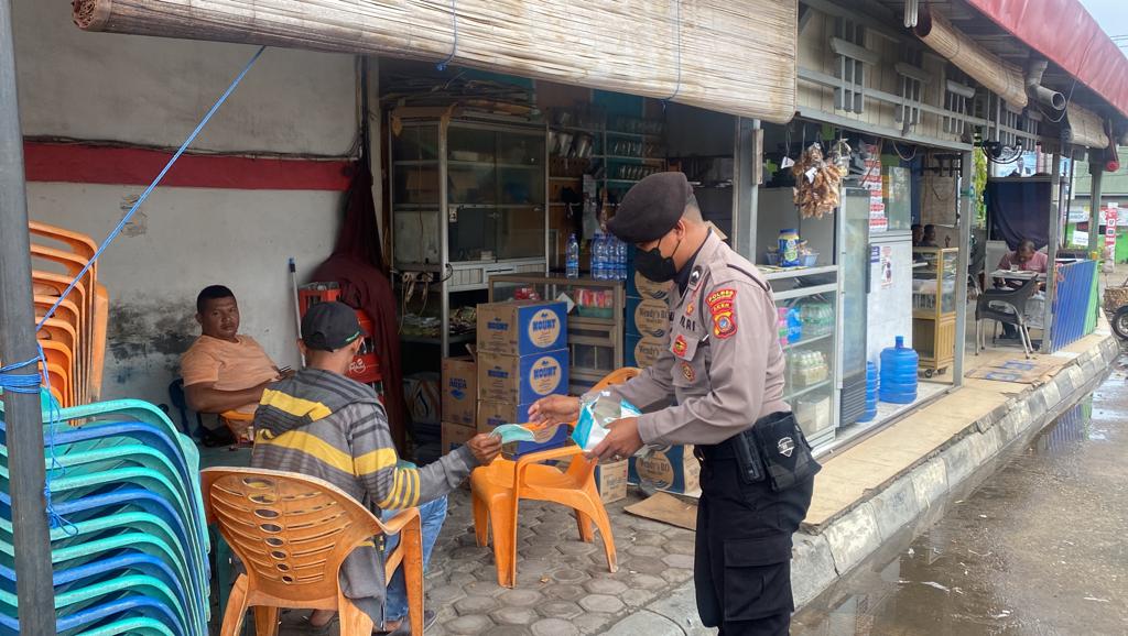 LHOKSEUMAWE,ikagawanews.id – Tim Unit Reaksi Cepat (URC) Siagam Polres Lhokseumawe melaksanakan patroli protokol kesehatan (prokes), dalam kegiatan itu personel membagikan masker kepada masyarakat di warung kopi (warkop) di seputaran Kota Lhokseumawe, Minggu (6/3/2022) pagi.