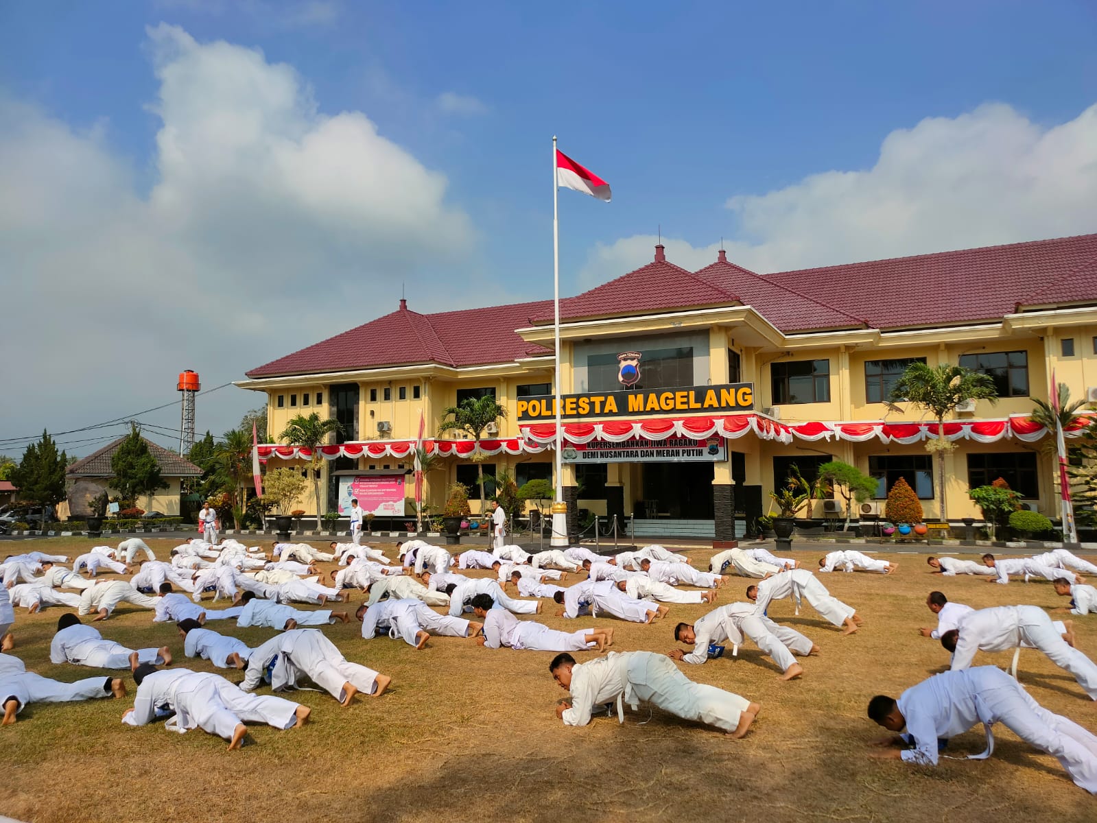 Ratusan personel jajaran Polresta Magelang tampak antusias mempraktikkan gerakan-gerakan yang dicontohkan oleh Tim Instruktur. Mulai dari pukulan, tendangan, dan tangkisan dan teknik lainnya.